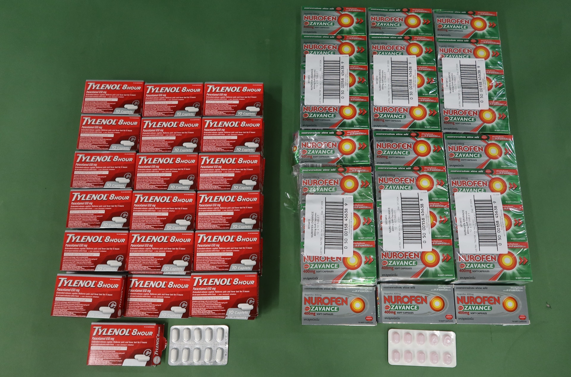 關員昨日(10日)在機場分別替一名準備前往內地海南的出境女旅客和一名從泰國曼谷入境香港的男旅客清關,於二人的手提行李中檢獲共約3,070粒、約4,388毫升和約186克懷疑受管制藥物,包括含撲熱息痛成分的止痛退燒藥、傷風藥、藥油和眼藥水,兩人隨即被海關拘捕。