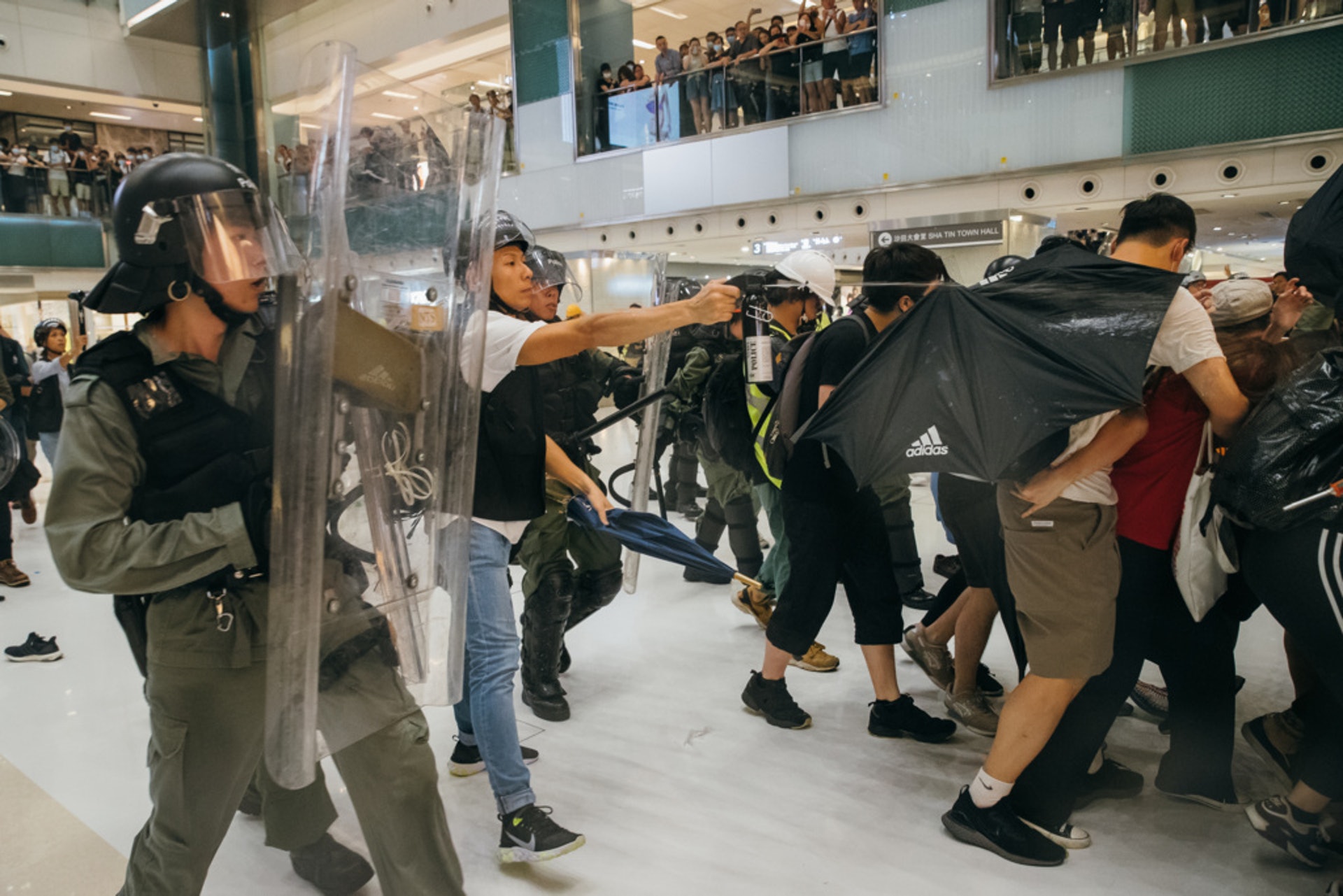 2019年7月14日晚上9時半後,有人聚集在沙田新城市廣場,警員進入後,有群眾從較高樓層擲下水樽及雨傘等硬物。(資料圖片)