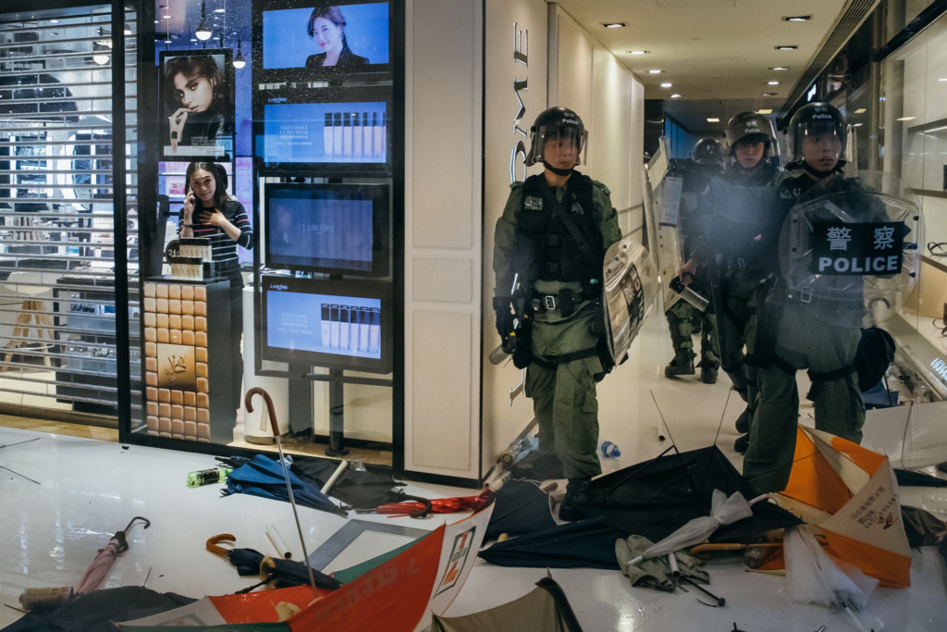 晚上9時54分,總警司梁子健帶領小隊到L3樓層,兩名男女警員遭人襲擊,其中女警19896更一度跌倒,並由男警葉卓軒用盾牌保護離開。(資料圖片)) p% I5 s0 Z X; }: C