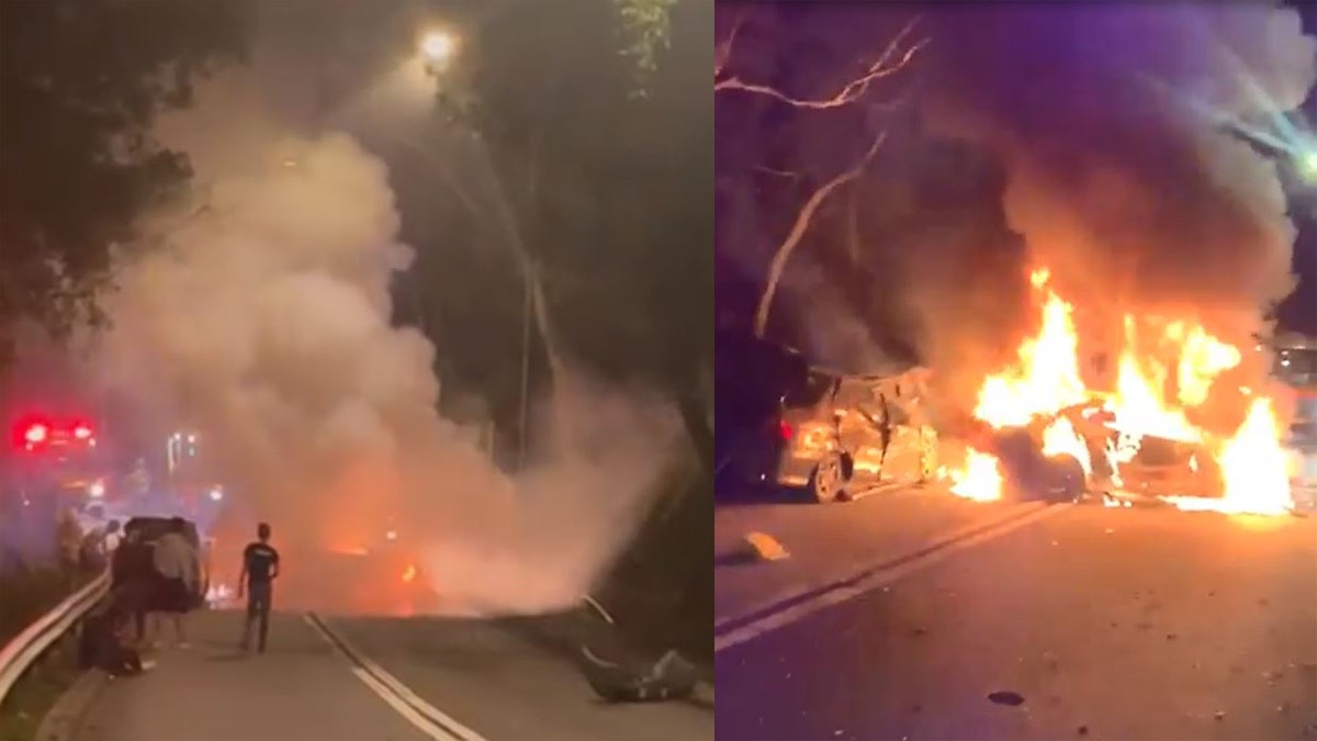 其中1段影片見到私家車起火期間,現場有大量濃煙冒出,一名男子坐在稍遠的路邊,而另一輛沒有起火的私家車有人被困,現場有人正進行救援,有一把男聲大叫「快啲救我老婆呀,我死咗都唔緊要呀」。其後消防員迅速到場,開喉將火撲熄,只見起火的私家車屬豐田品牌,全車儼如廢鐵。