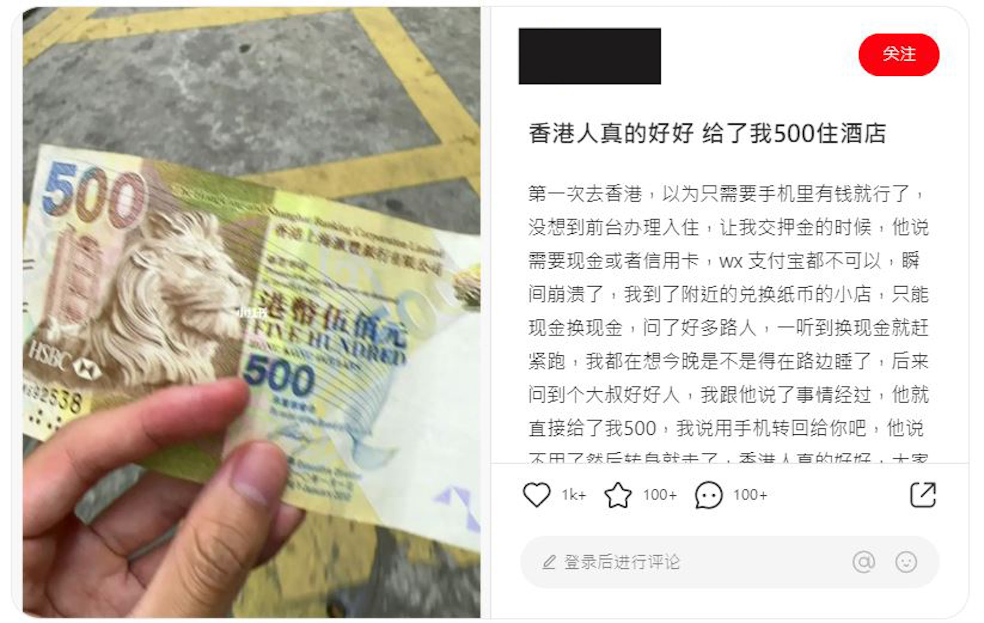 該內地男於小紅書以「香港人真的好好,給了我500住酒店」為題發文,指他日前第一次來香港,以為只需要手機裏有錢就萬事俱備,沒想到到酒店辦理入住手續時,押金竟要用現金或信用卡支付,令只有手機支付的他瞬間崩潰。