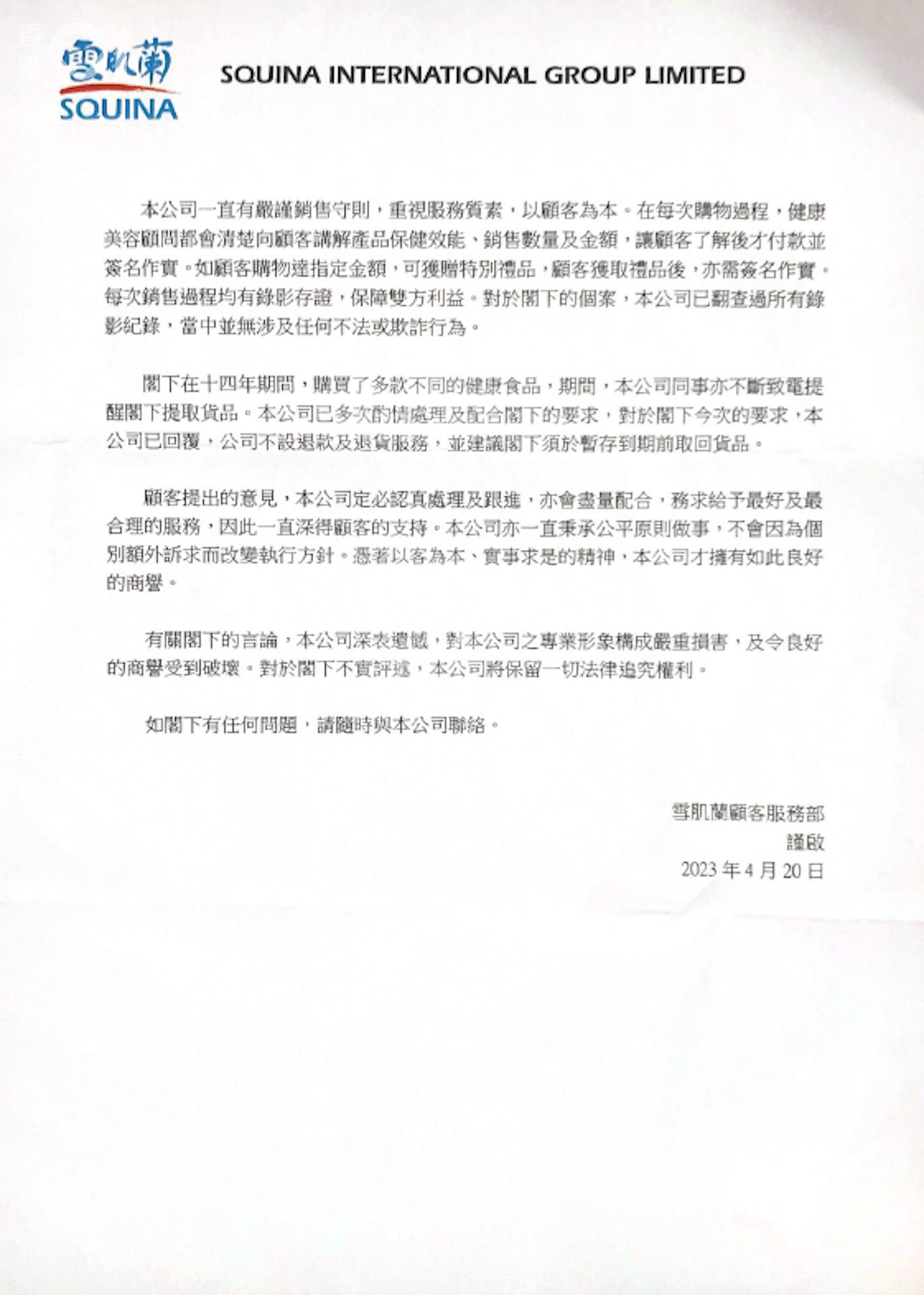 雪肌蘭拒絕回覆記者的查詢,但有書面去信婆婆。(受訪者提供)/ U$ i- |3 r |! u* V* m