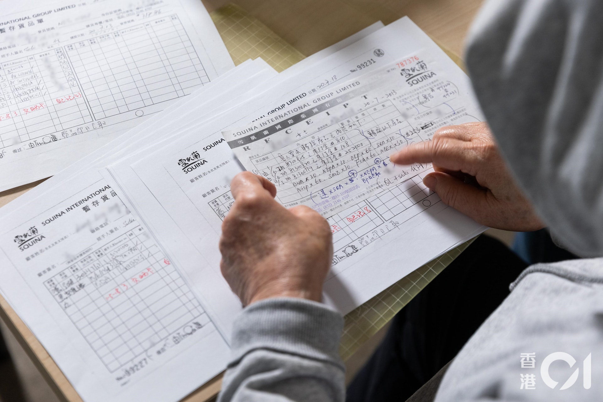 陳婆婆保存了每次消費的單據,當中多次消費,都是一次過買幾十樽,甚至是過百樽產品。(鄭子峰攝)" F b5 h8 g4 R2 \2 P) p