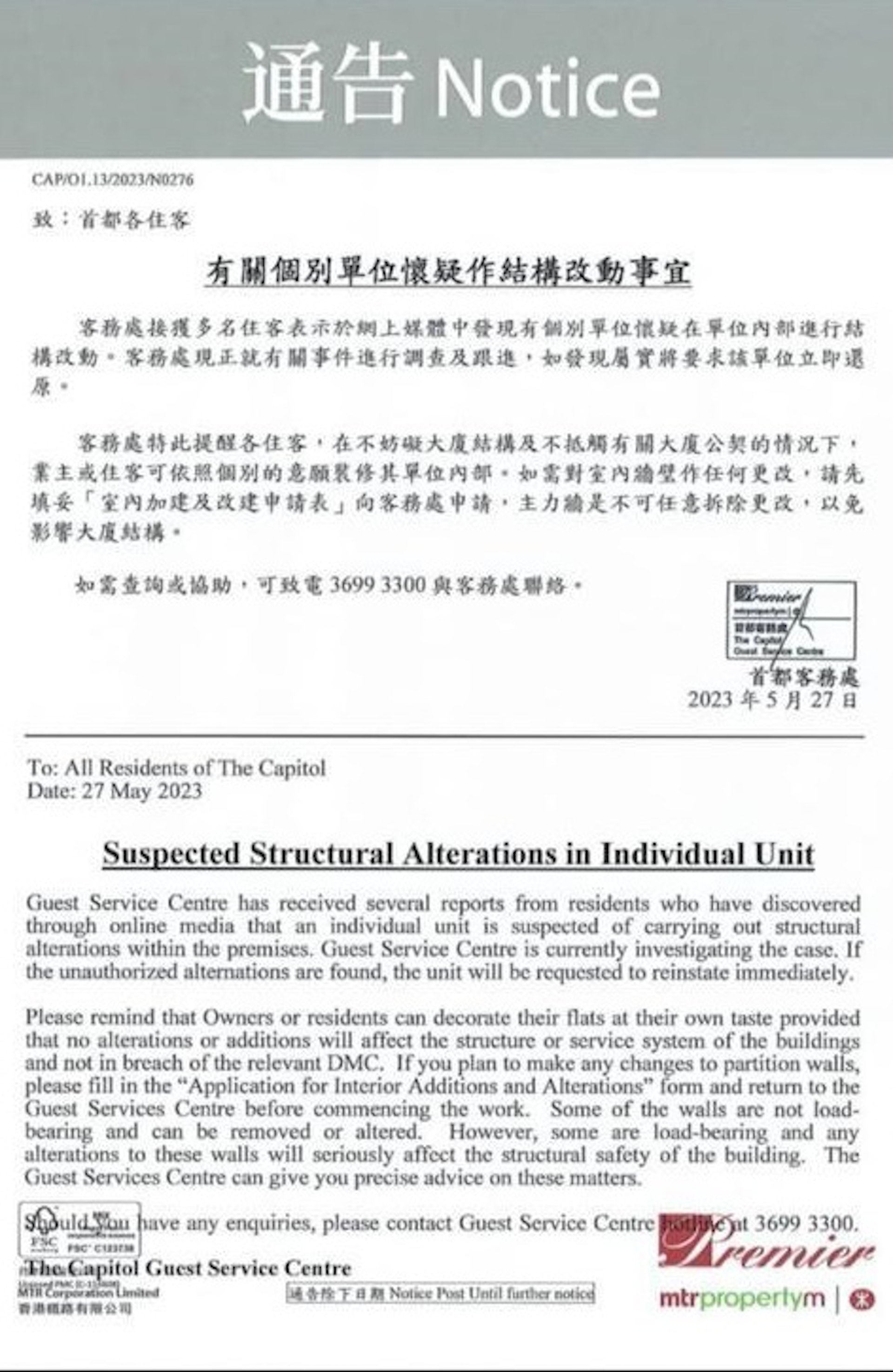 事件於網上發酵了一整天後,首都客務處昨日發出通告,指接獲多名住客表示於網上媒體中發現有個別單位懷疑在單位內部進行結構改動,客務處現正就有關事件進行調查及跟進,如發現屬實將要求立即還原單位。客務處又提醒住客,指在不妨礙大廈結構及不抵觸有關大廈公契的情況下,業主及住客可按照個別意願裝修其單位內部。如需對室內牆壁作任何更改,要先填妥「室內加建或改建申請表」向客務處申請,又指主力牆是不可任意拆除更改,以免影響大廈結構。