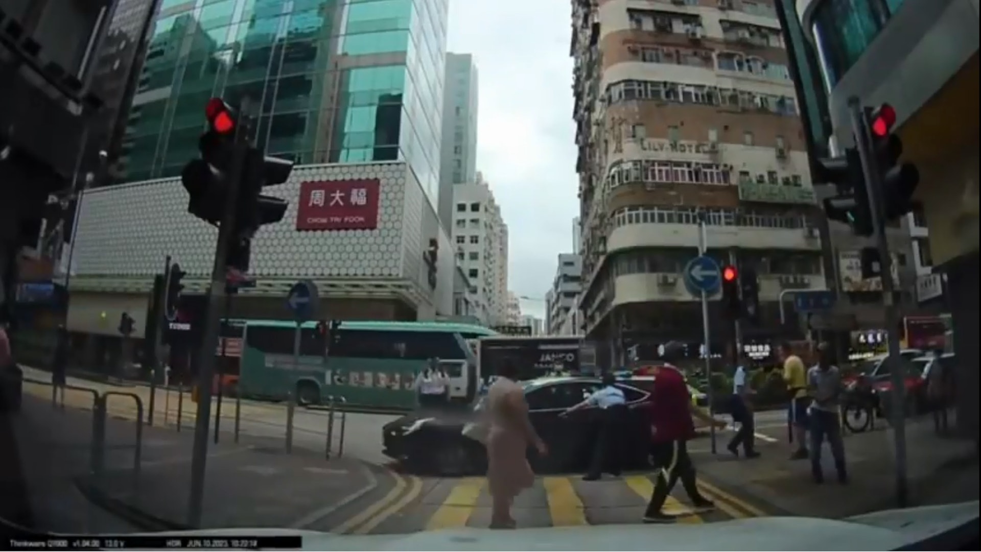n5 m+ ~* H+ Z( G" s4 j) O2 KTesla高速駛至登打士街,幾乎撞到一名正過路的男途人。(網上影片截圖)os.tvboxnow.com# w# n) K1 {% O6 U5 m. K
