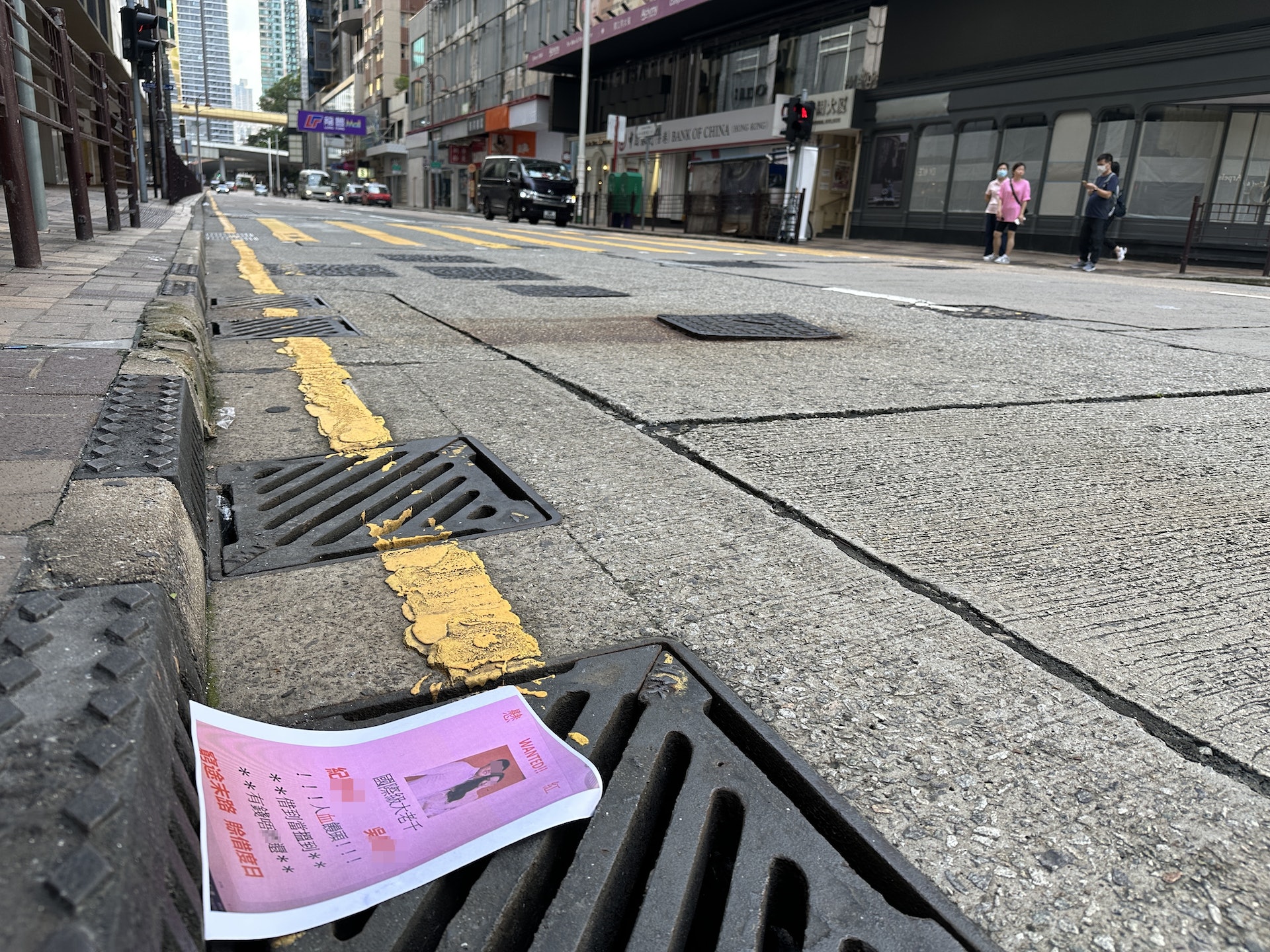 尖沙嘴海港城外今日(5日)清晨7時許,出現兩張追債海報。(劉鑫梅攝)