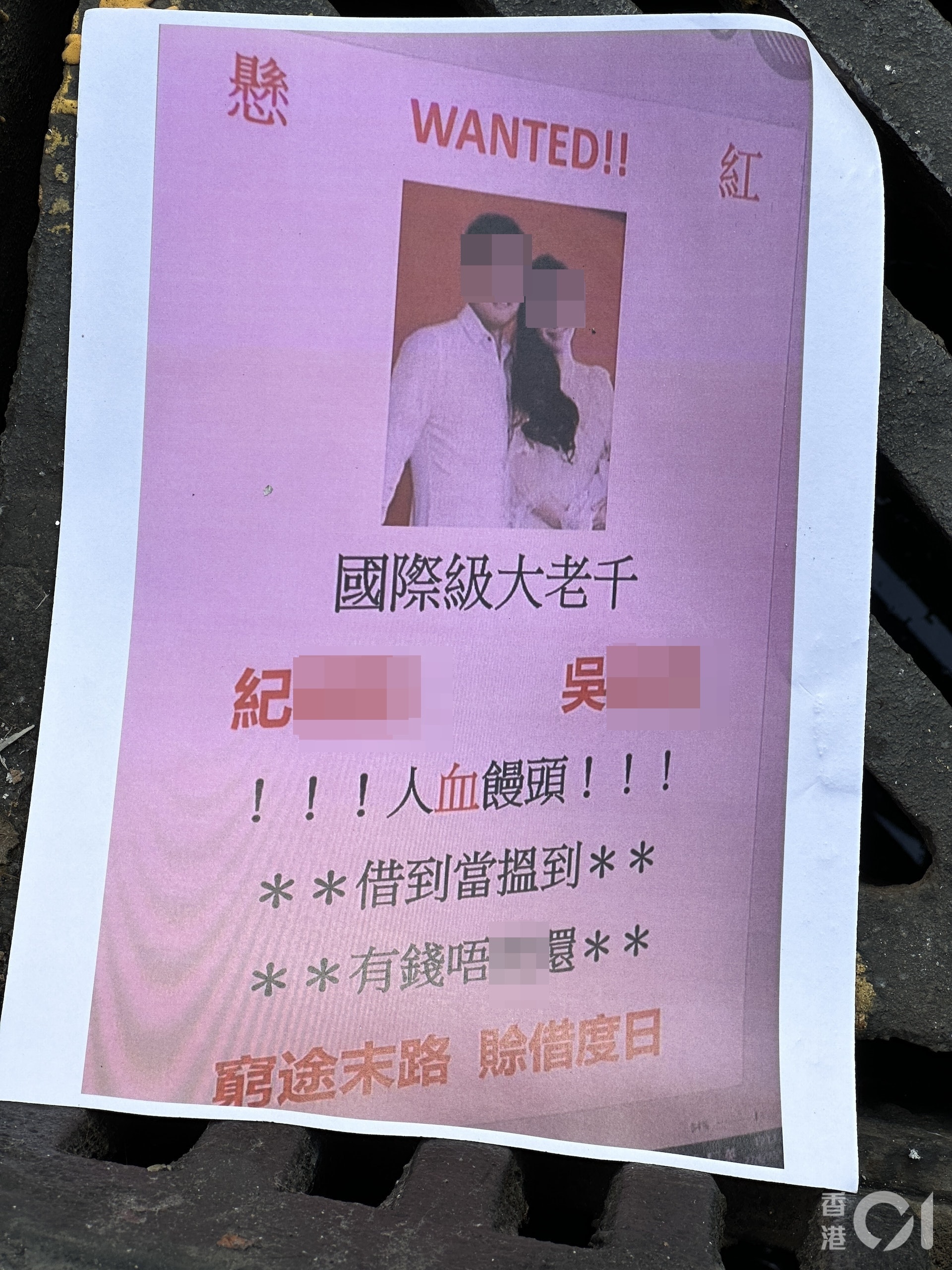 尖沙嘴海港城外今日(5日)清晨7時許,出現兩張追債海報。海報印有一對男子照片,內容指紀姓男子及吳姓女子「借到當搵到」,賒借度日,形容二人為「國際級大老千」。公仔箱論壇+ U# W, @( q1 z/ ?' f