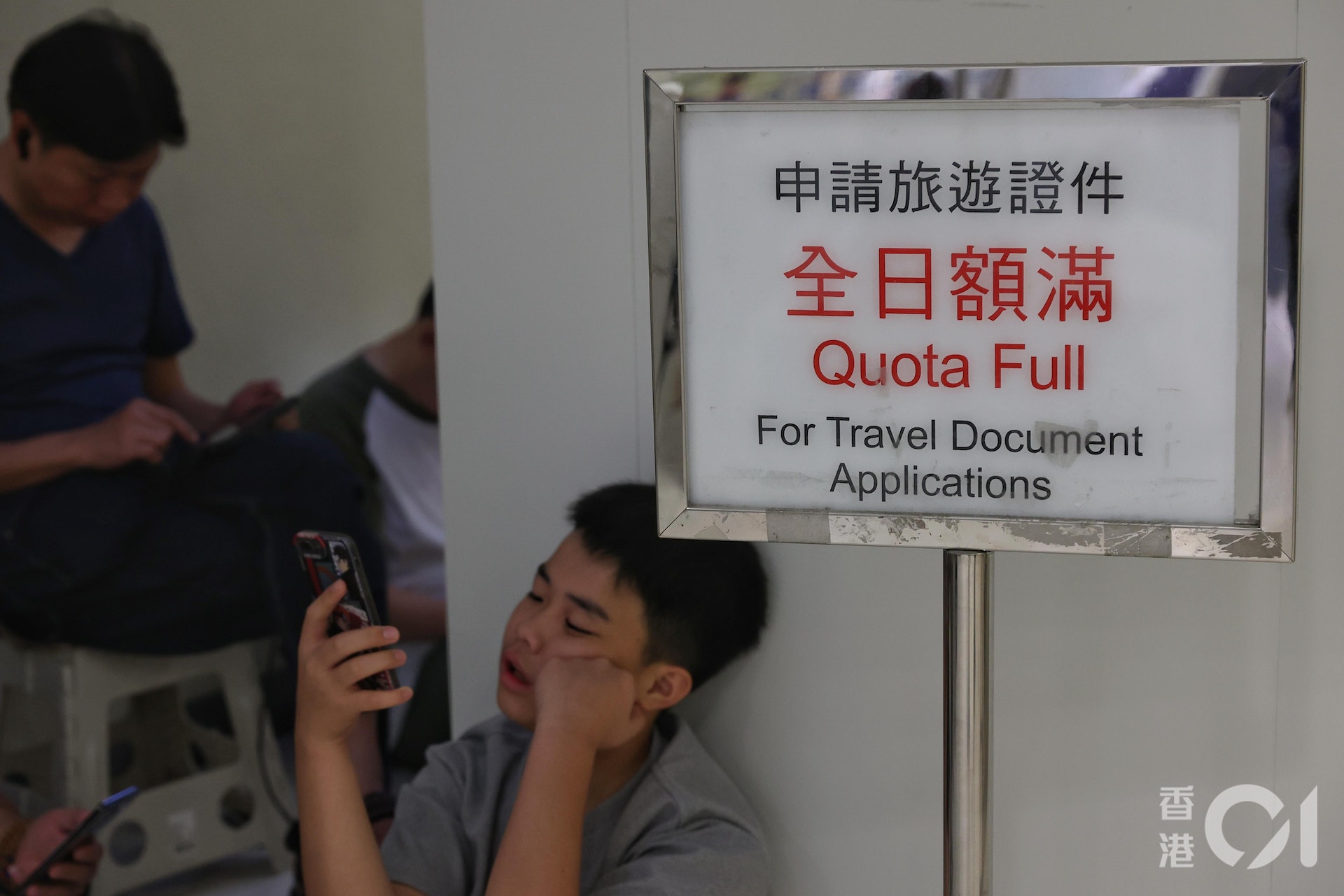 現場豎立「申請旅遊證件全日額滿」的告示牌,但依然有人陸續來排隊,牆上貼有多張公告,強調「嚴禁進行兜售及推銷等商業行為」,亦有私隱署公告,提醒委託他人處理個人資料的風險。+2保險經紀向隅 即場搵「排隊黨」不果