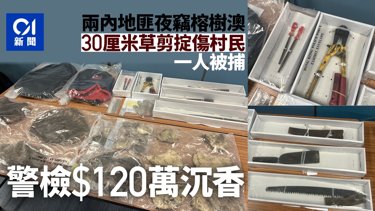 兩名由內地來港的男子,涉連環爆竊西貢榕樹澳村屋及偷沉香,被撞破後更用30厘米草剪擲傷村民。警方昨早(8日)在附近一帶大舉巡邏期間發現兩人,截查之際遇上激烈反抗,最終一人就擒、另一人成功逃去。警方起獲逾20件約重8.25公斤沉香,初步估計約值80萬至120萬元;竊案則涉款約11萬元。警方現正追緝在逃同黨。