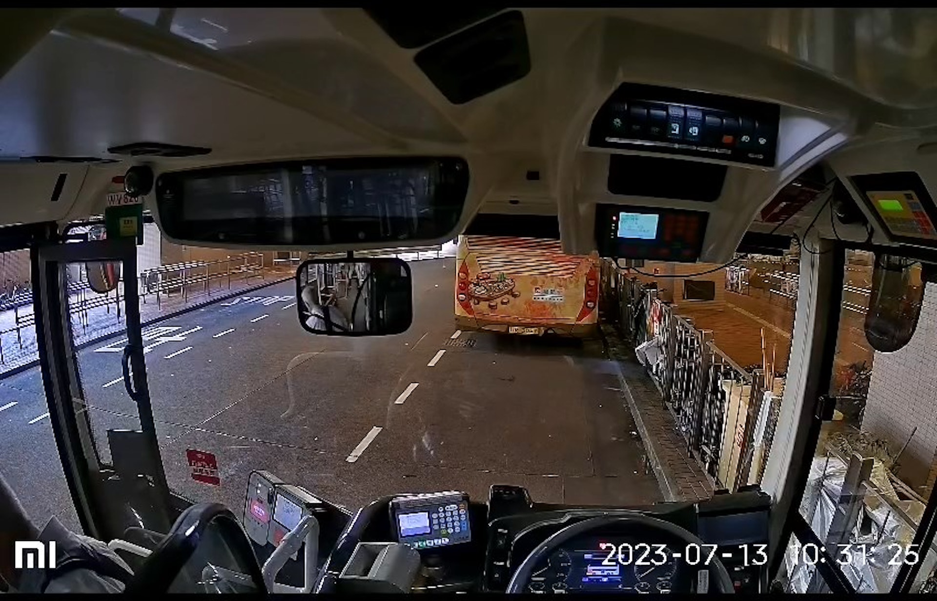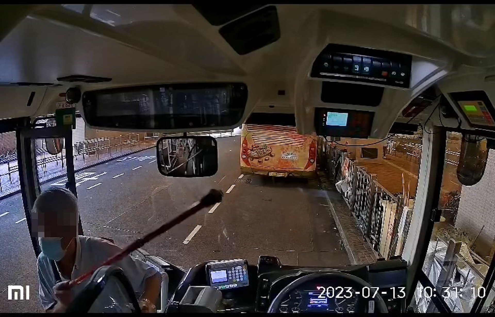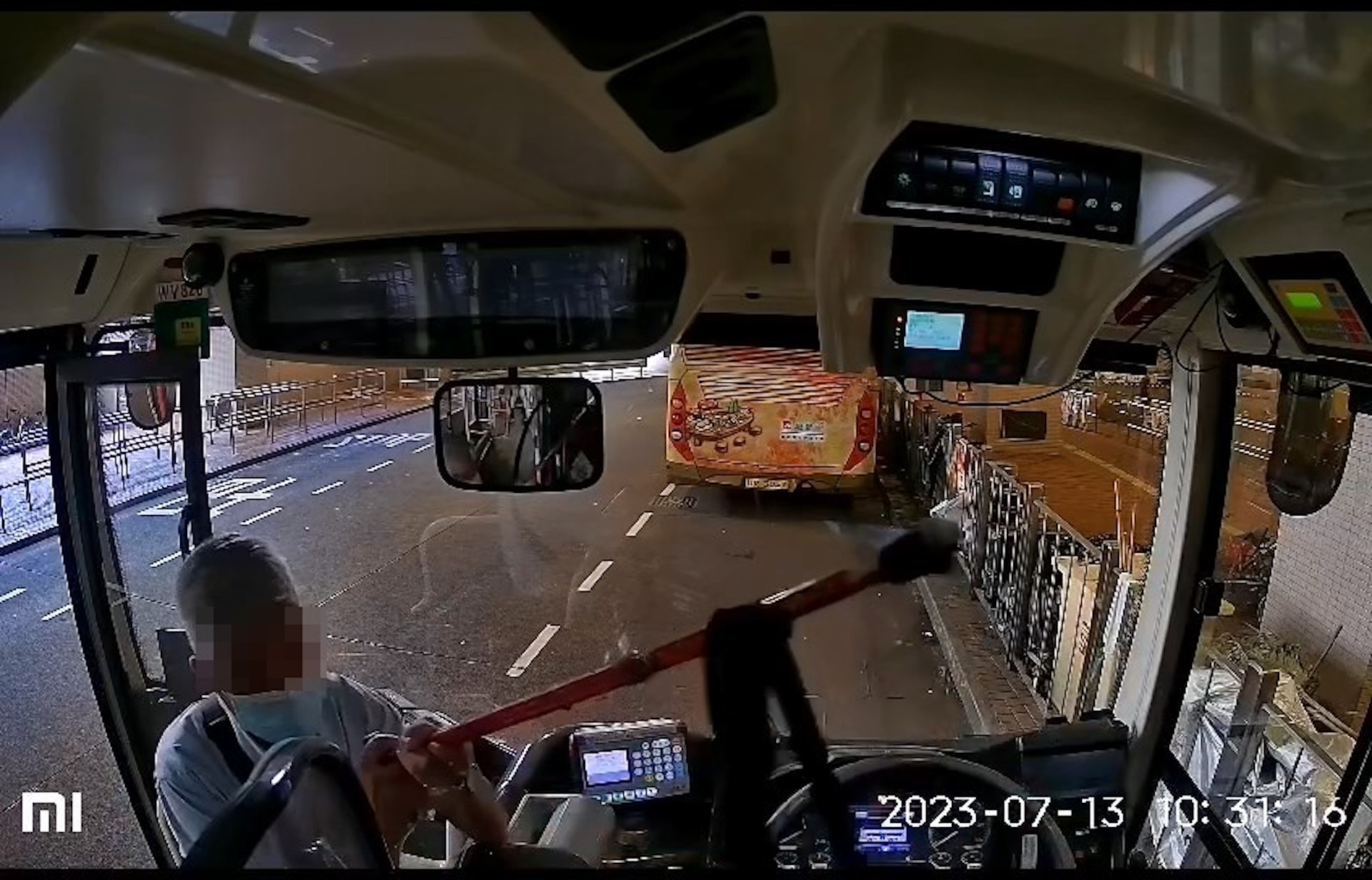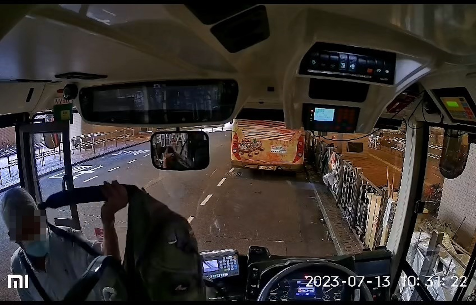 5 @% R4 z: b, ctvb now,tvbnow,bttvb手持拐杖的老翁,暗中由車頭上客位登上一輛無人巴士,伸出拐杖勾走放於司機位的一個背囊。(網上影片截圖)公仔箱論壇. ^- q; S6 b5 R( W& n. T