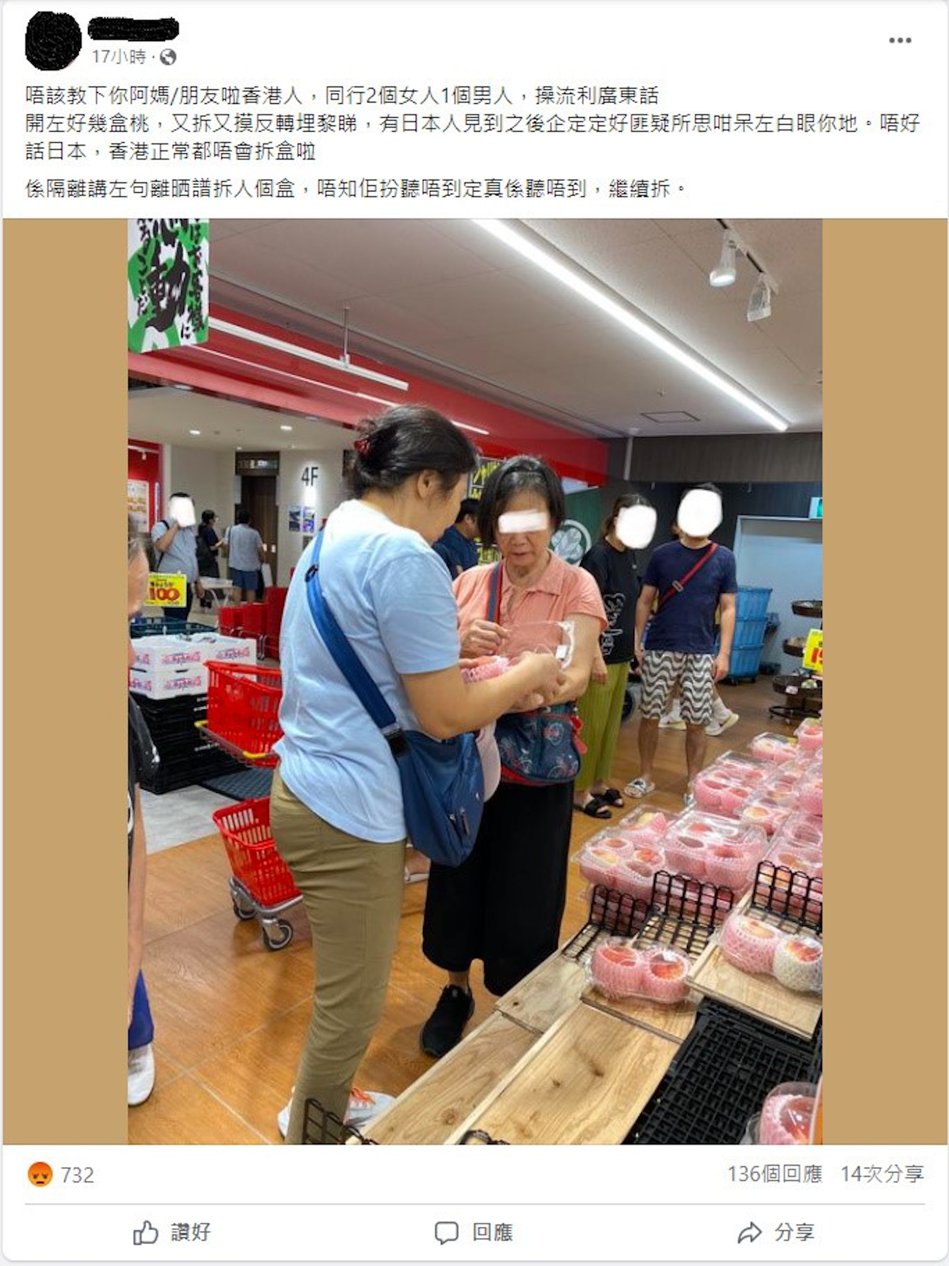 昨日(3日),有網民在Facebook群組「九州福岡地道情報站」中發帖,指自己在日本中遇到3個流利廣東話的遊客,當中2個是女性,1個是男性。他們在日本商店中直接將桃的包裝盒打開,「又拆又摸又反轉埋嚟睇」,並指有日本人看到他們的行為後「企定定,匪夷所思咁呆咗望住佢地」。樓主指自己在他們隔壁說了一句「離曬譜、拆人個盒」,但不知道那3個人是真的沒聽到還是裝作聽不到,反正還是繼續拆盒,「唔好話日本,香港正常都唔會拆盒啦」。TVBNOW 含有熱門話題,最新最快電視,軟體,遊戲,電影,動漫及日常生活及興趣交流等資訊。! i6 p2 D. `% X. d8 {, R' S