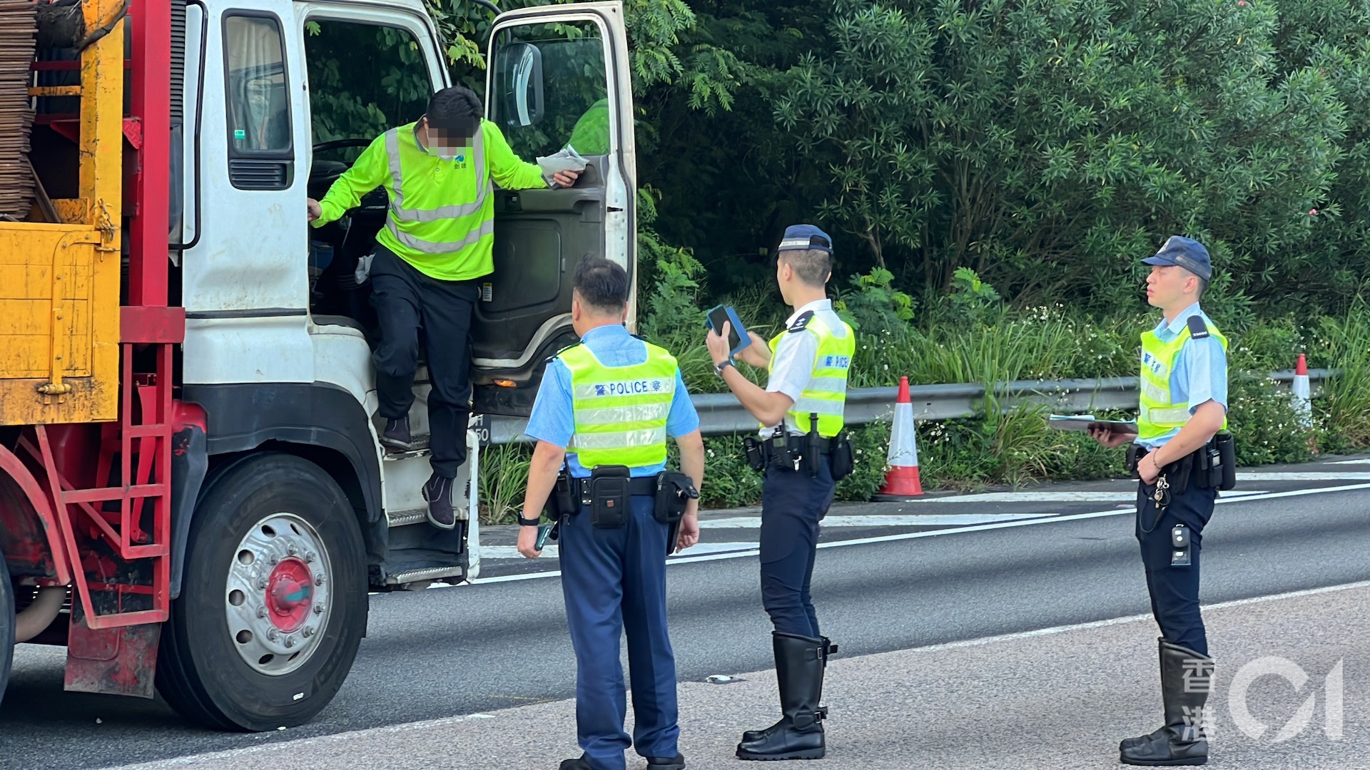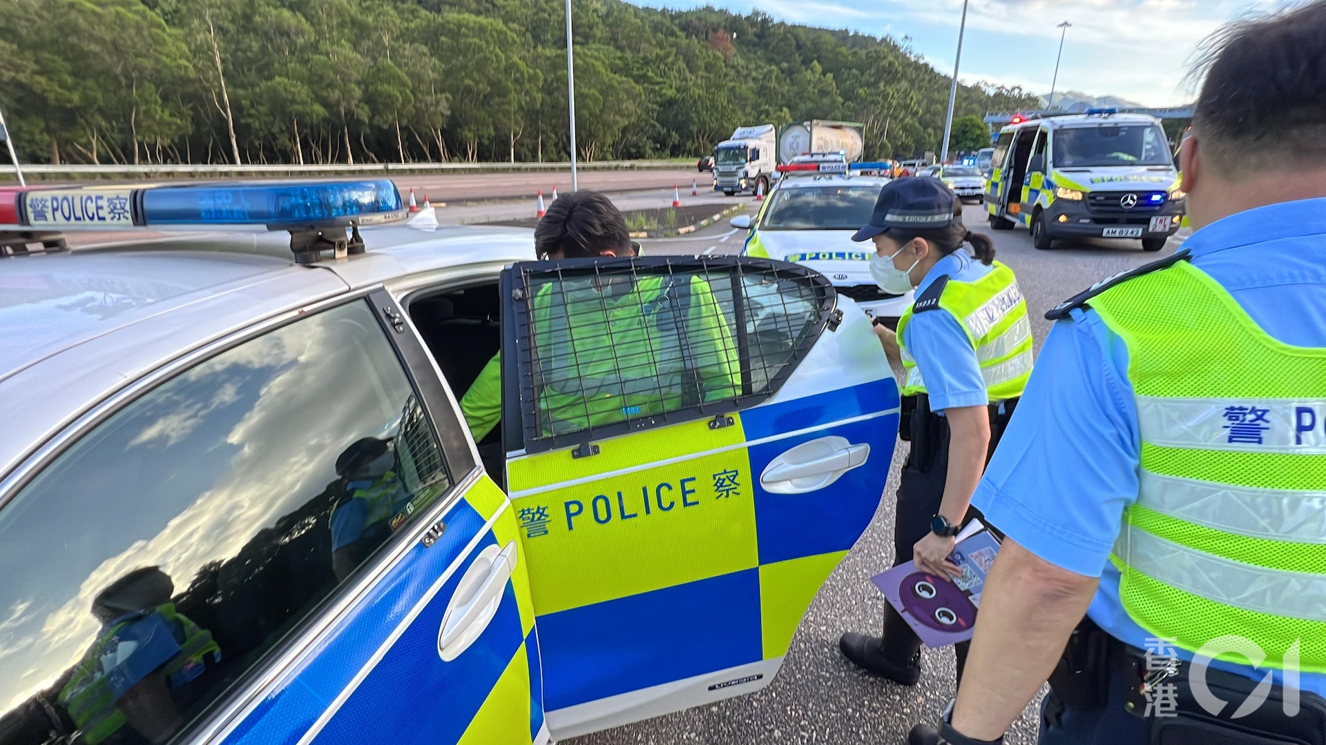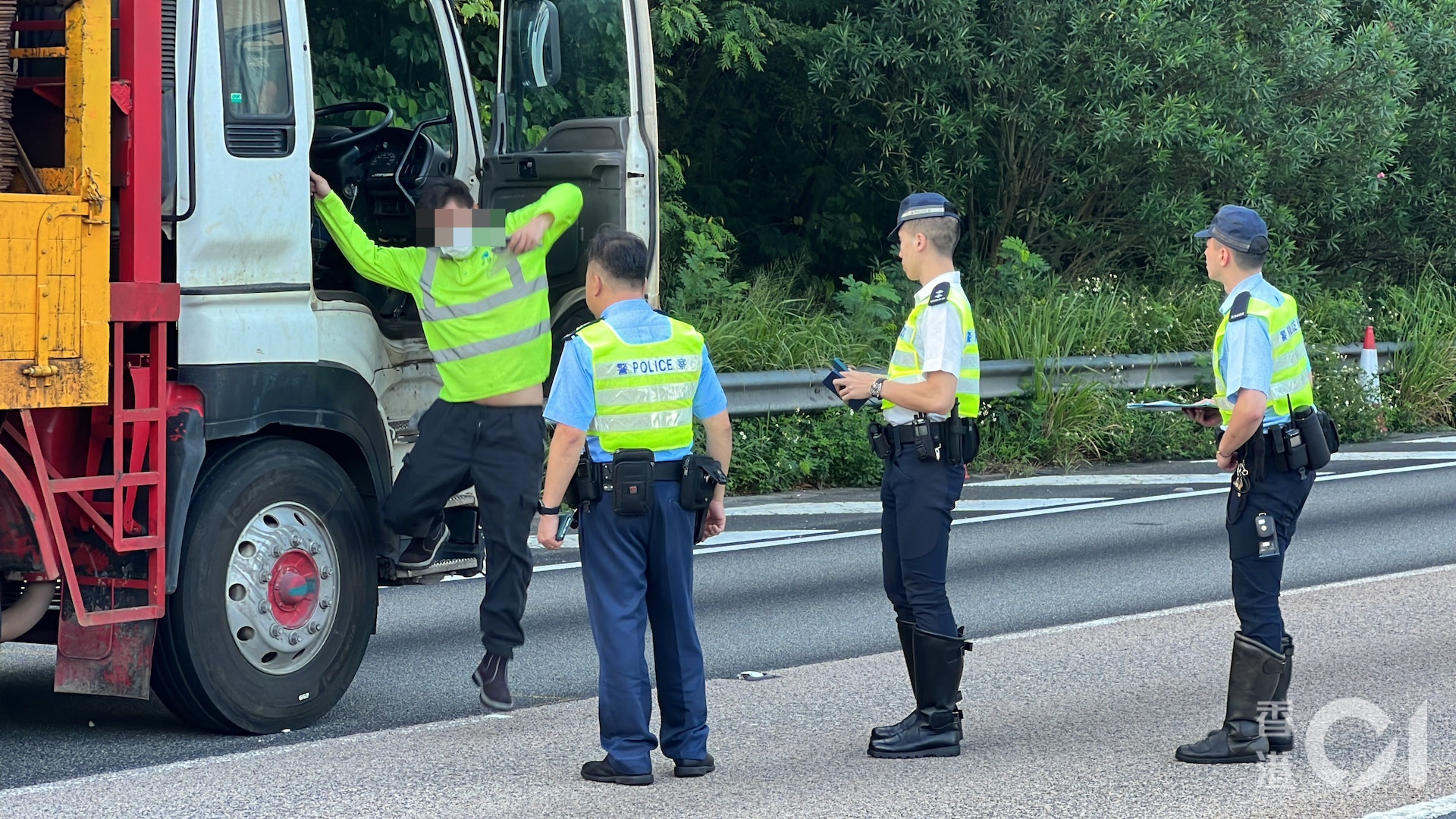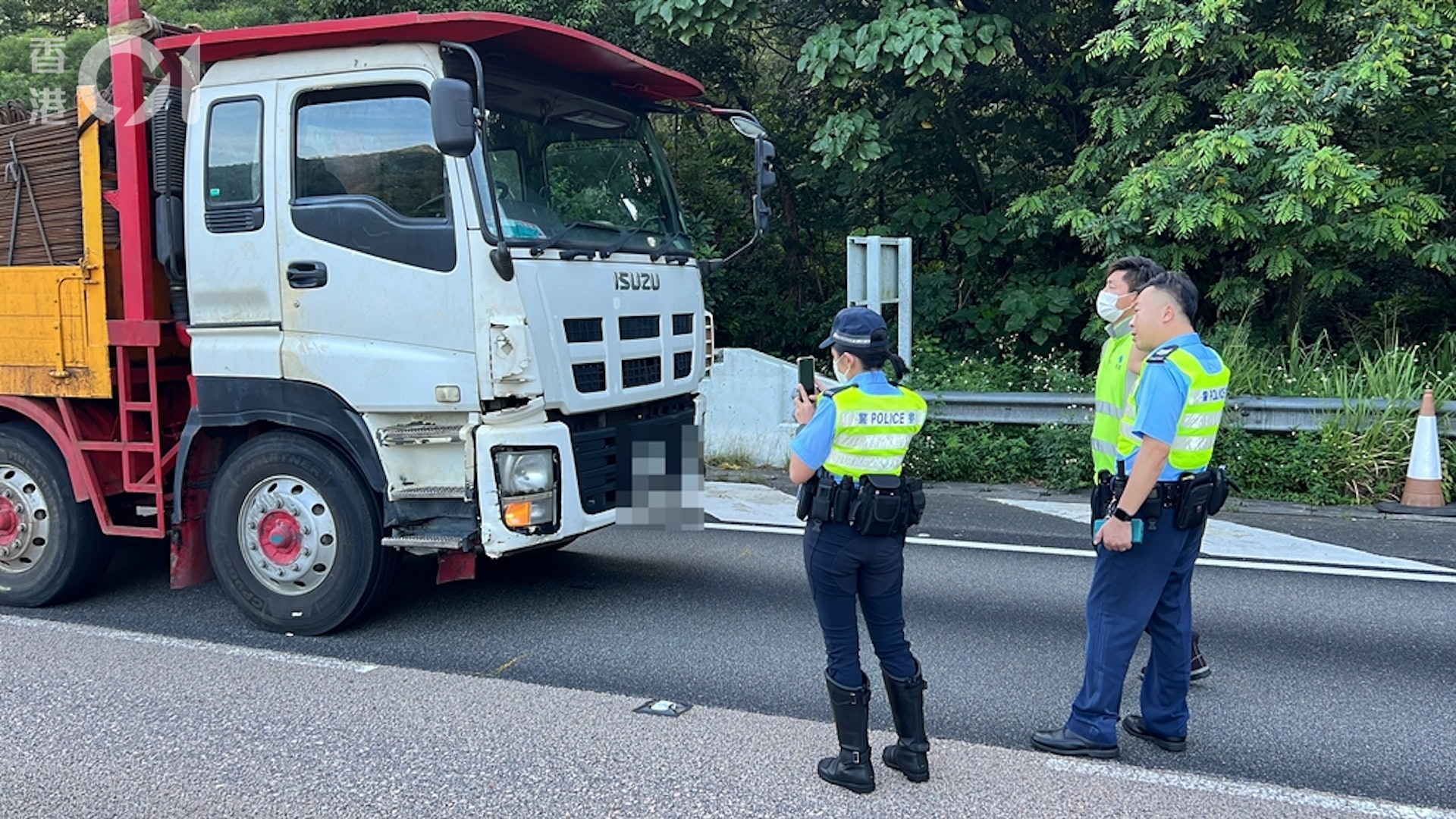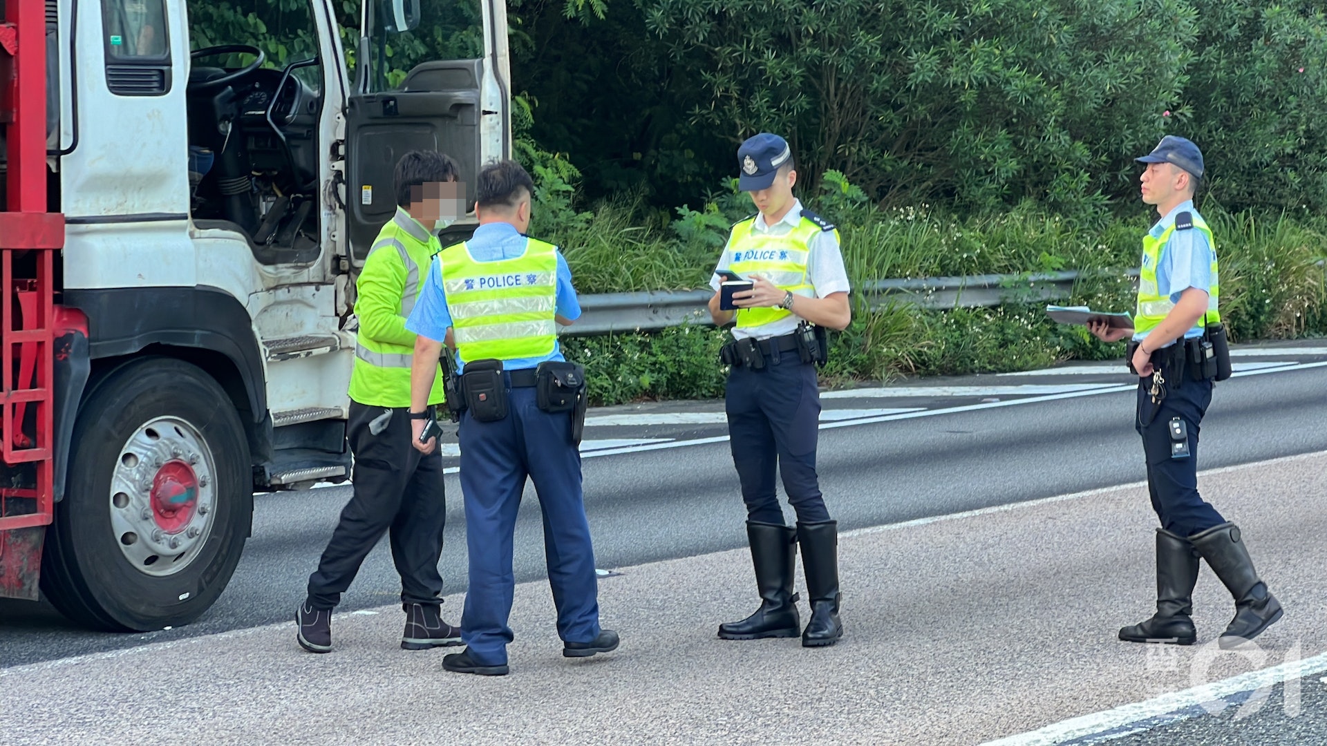 6 R3 J/ Y7 N/ w5 b6 C. U公仔箱論壇重型貨車意外後在中慢線停下,姓曾(32歲)司機被帶上警車協助調查。(翁鈺輝攝)# b. b( }1 s4 F# E# m