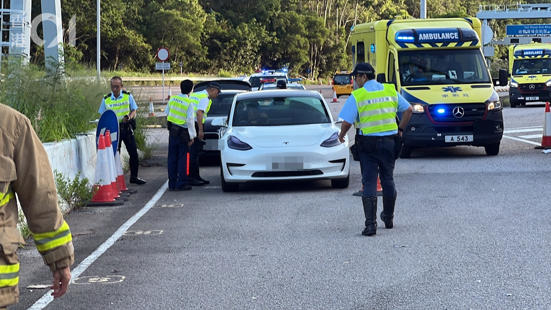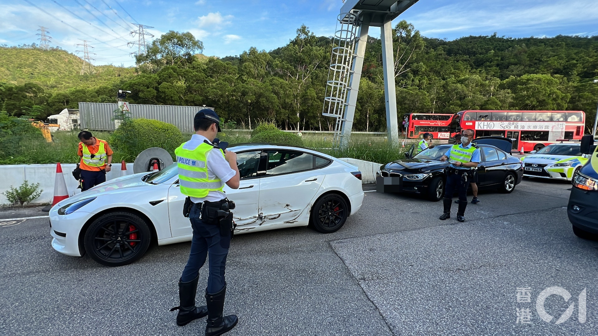 較早前一架TESLA與寶馬私家車,經過大欖隧道收費亭相撞。兩車相撞後繼續向前行,駛至避車處。寶馬司機步出車之際,被從後駛至的重型貨車撞倒重創。(翁鈺輝攝)