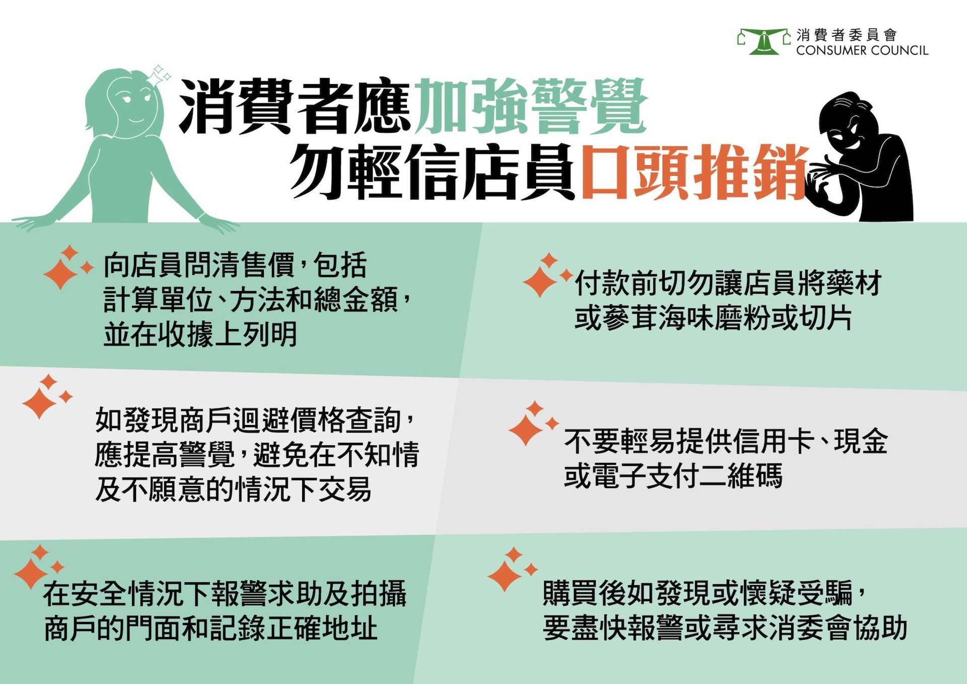 消委會周四(9月7日)召開記者會,點名譴責銅鑼灣的四間藥店涉嫌不良營銷。這些藥店收到大量投訴,大部份投訴涉「斤變両」、「両變錢」,令顧客最後要付較原先理解貴10倍的、甚至16倍的價錢。當顧客有購買意欲,店員亦會迅速將藥材或蔘茸海味切片,藉以強迫顧客完成交易。/ M; G8 G2 M, F* w" G7 G) b4 I( T2 o