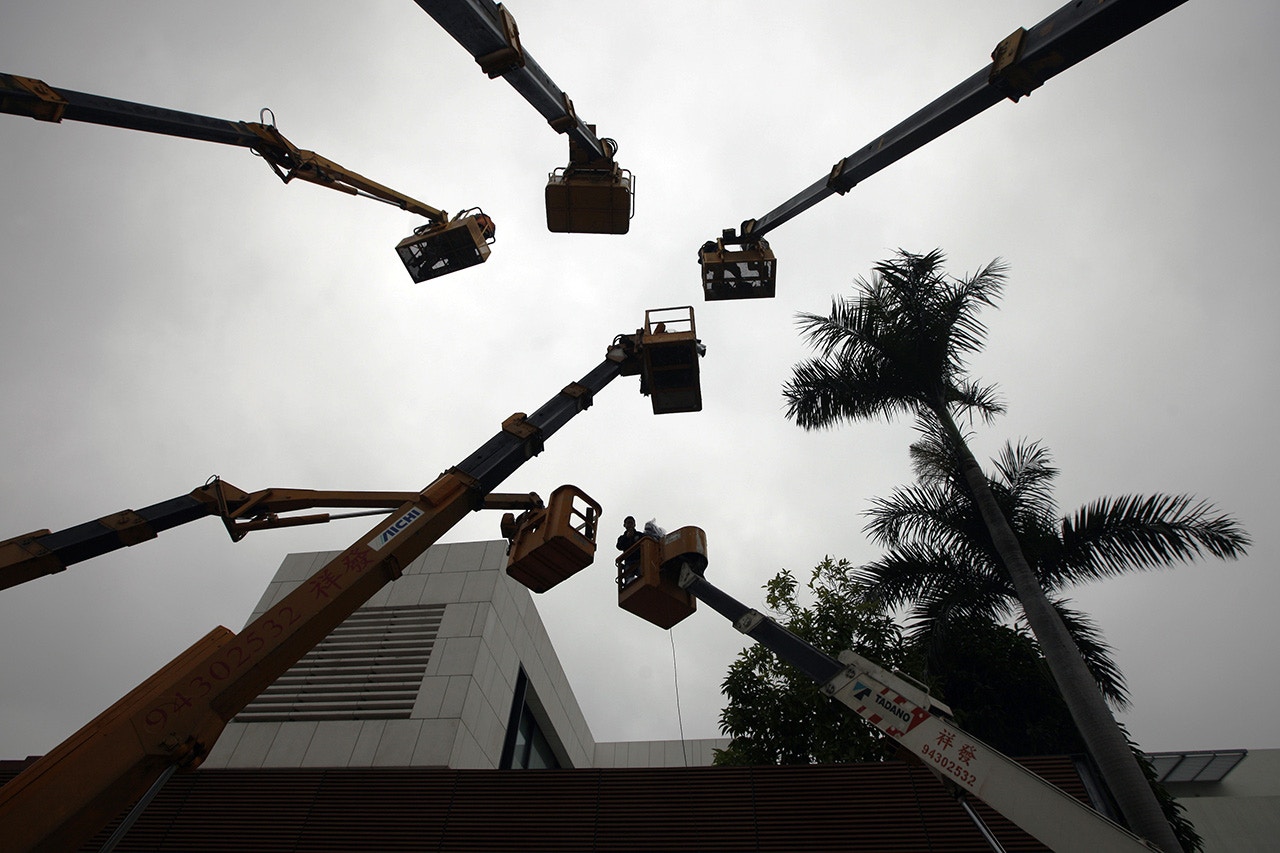 ) s5 o: o" ?( k8 O2012年時,航拍機仍未普及,傳媒租用吊臂車觀看約道「唐宮」,成為經典一幕。(Tyrone Siu / 路透社)7 l R0 o( X* V- i: q