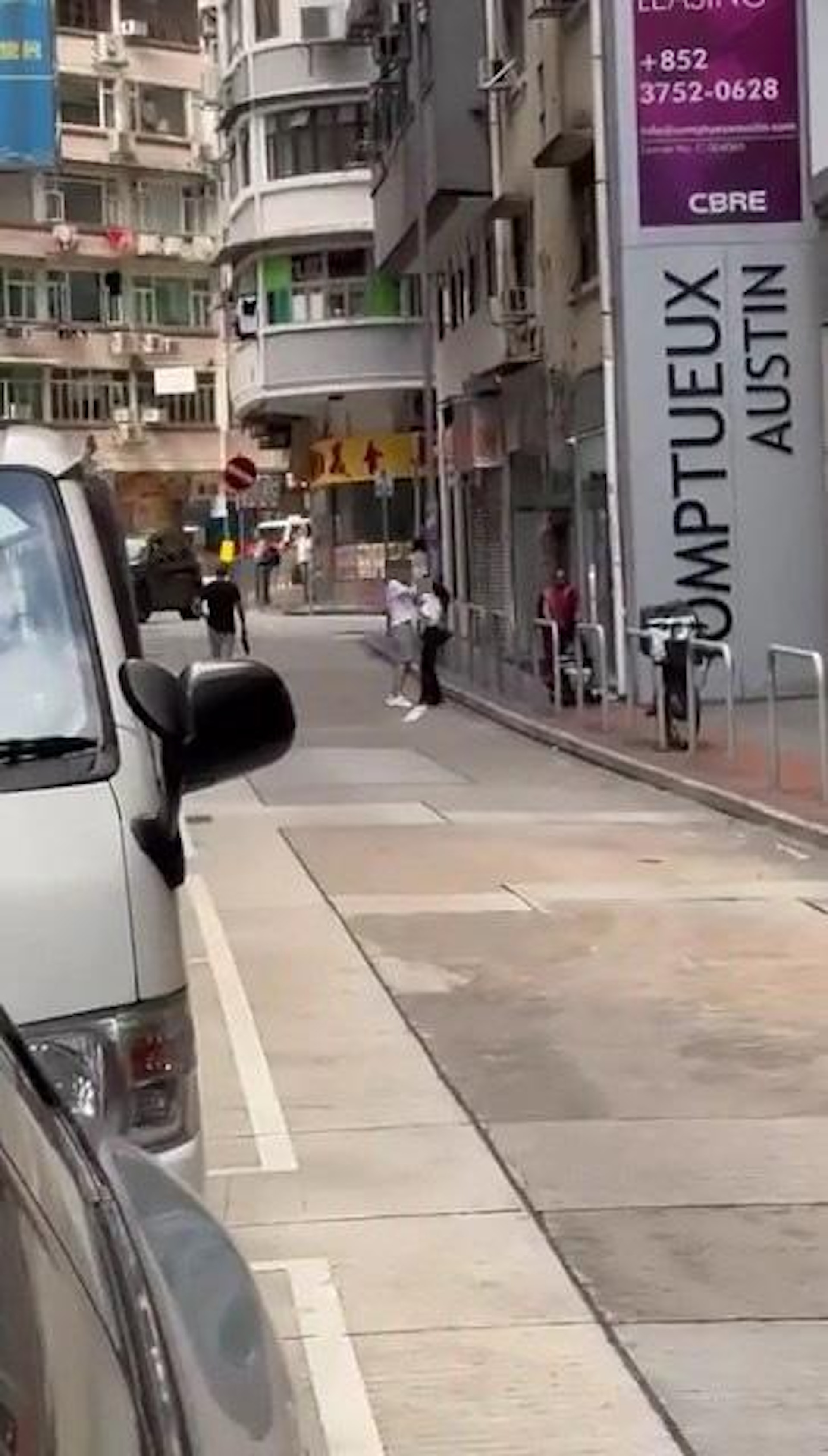 女方被打到步履不穩,惟白衣男怒火未熄,高呼「咩話?」後就連環使出2拳打向女方頭部,邊打邊喊「X你老X!X你老X!」。(影片截圖)