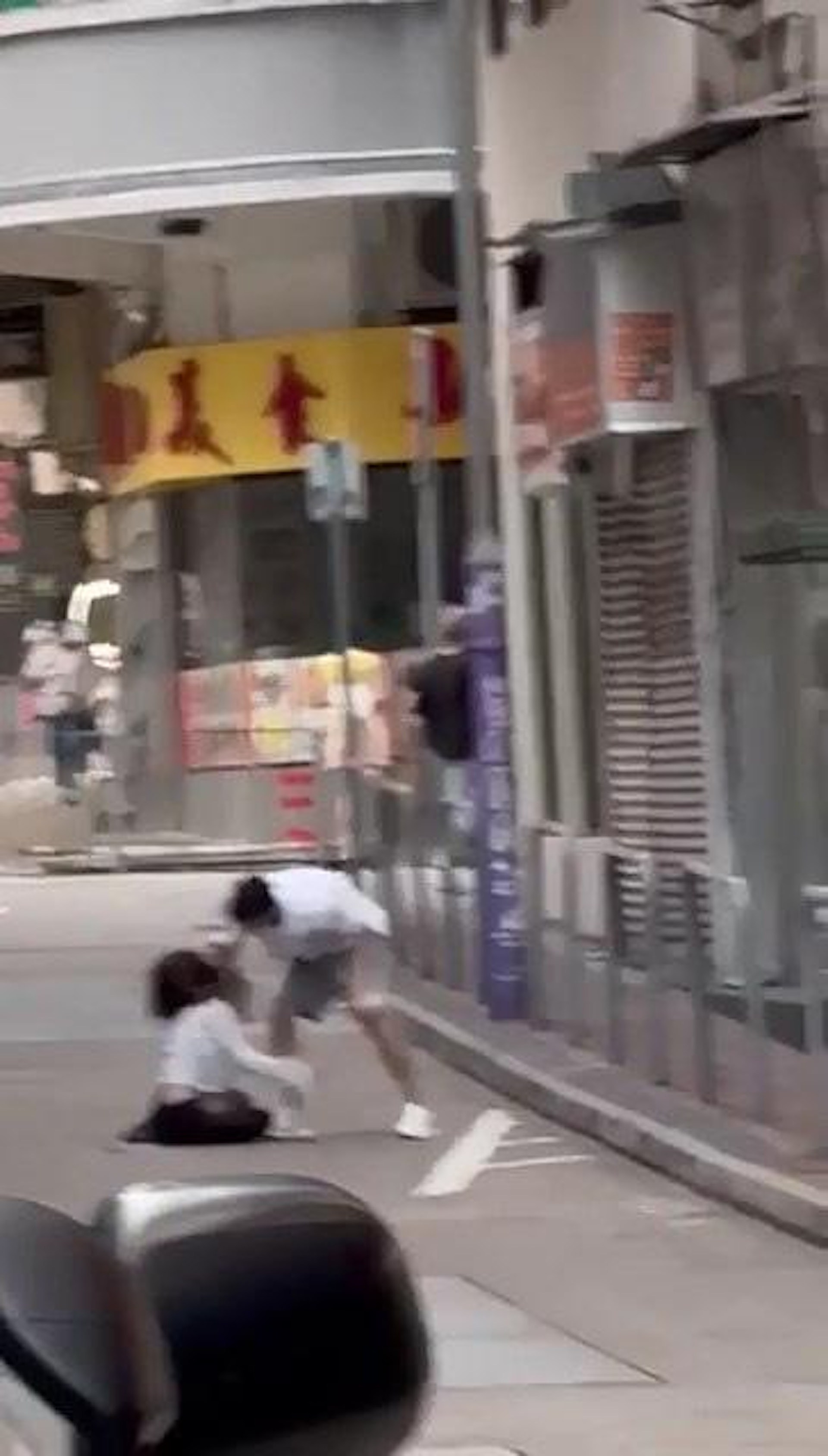 本港網上瘋傳1段影片,見到該對男女在馬路上爭執,其間男方掌摑女子臉部、連環出拳打頭、再起腳衝力踢頭,打到女子跪在地上。(影片截圖)0 t T8 n9 k+ d. i6 Z$ K4 N: k( ^