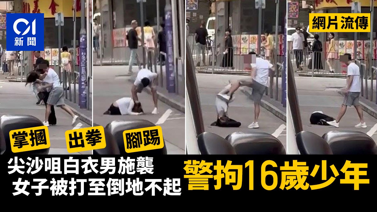 網上日前傳出一段影片,可見尖沙咀街頭馬路上有一對男女爭執,期間男方爆粗掌摑女子臉部、連環出拳打頭、再起腳衝力踢頭,打到女子跪在地上,甚至倒地不起。警方經調查後相信事件涉及感情問題,昨日(25日)在尖沙咀區以涉嫌「襲擊致造成實際身體傷害」罪名拘捕1名16歲少年,他現正被扣留調查。據了解,該對男女為情侶關係,但警方暫未尋獲女事主,仍未得悉其傷勢狀況。