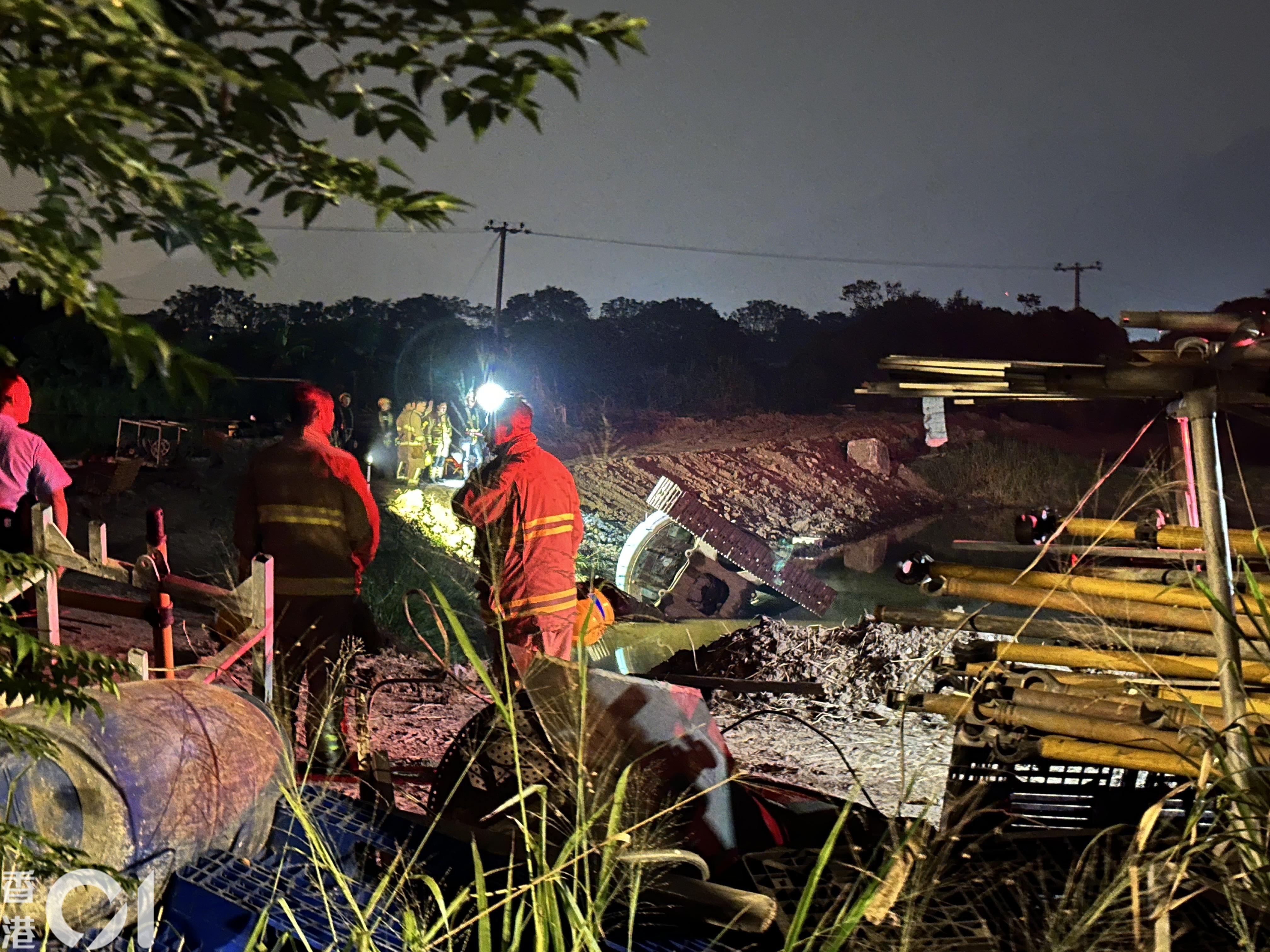 元朗大生圍有挖泥車跌入魚塘,消防到場搜救近兩小時後,救起一名失蹤男子,他已陷昏迷。(王譯揚攝) |