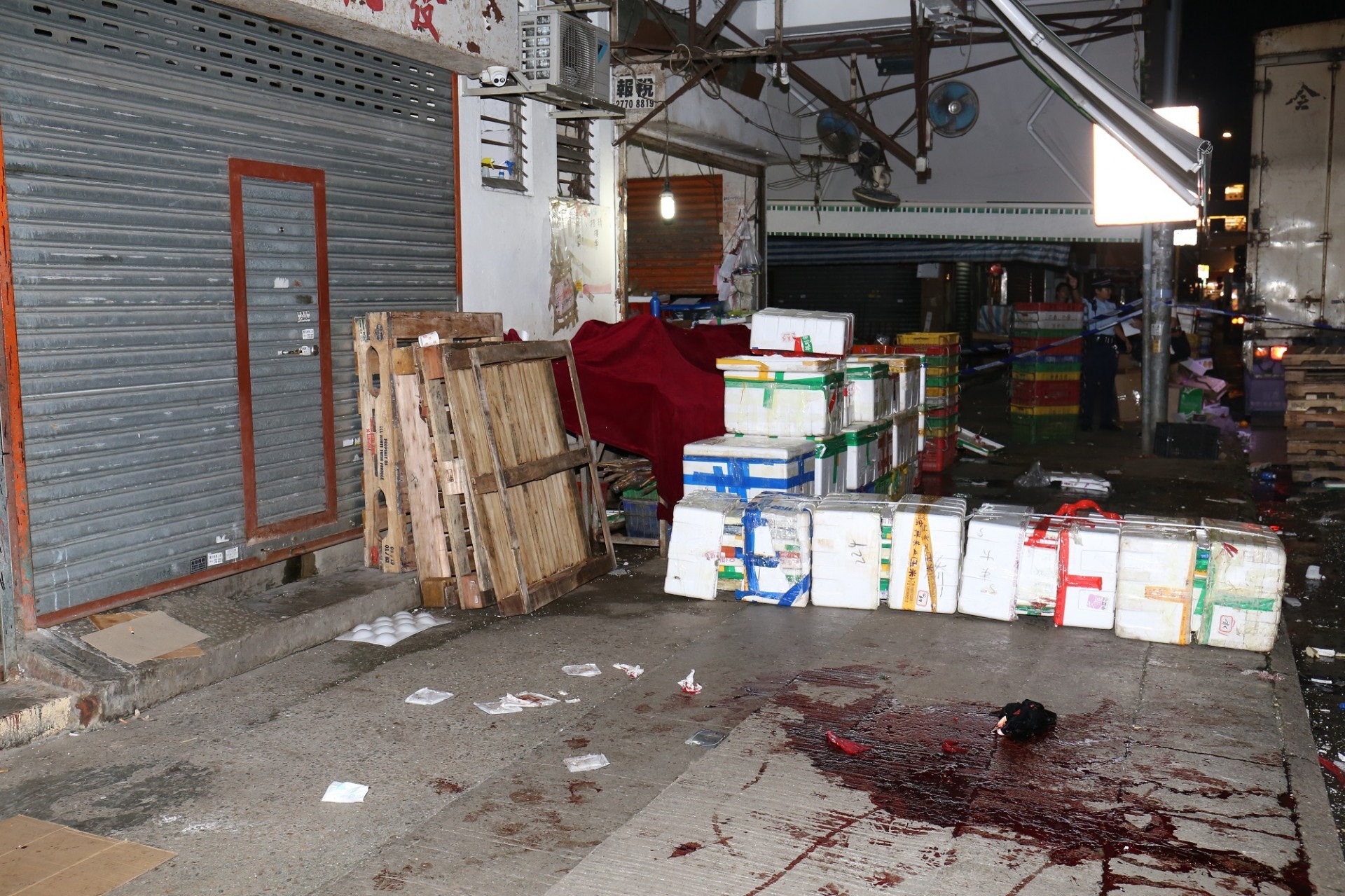 R5 x, h* X3 X* J+ y; X/ c元朗髮型屋奪命兇案︰現場遺有血漬。(陳浩然攝)