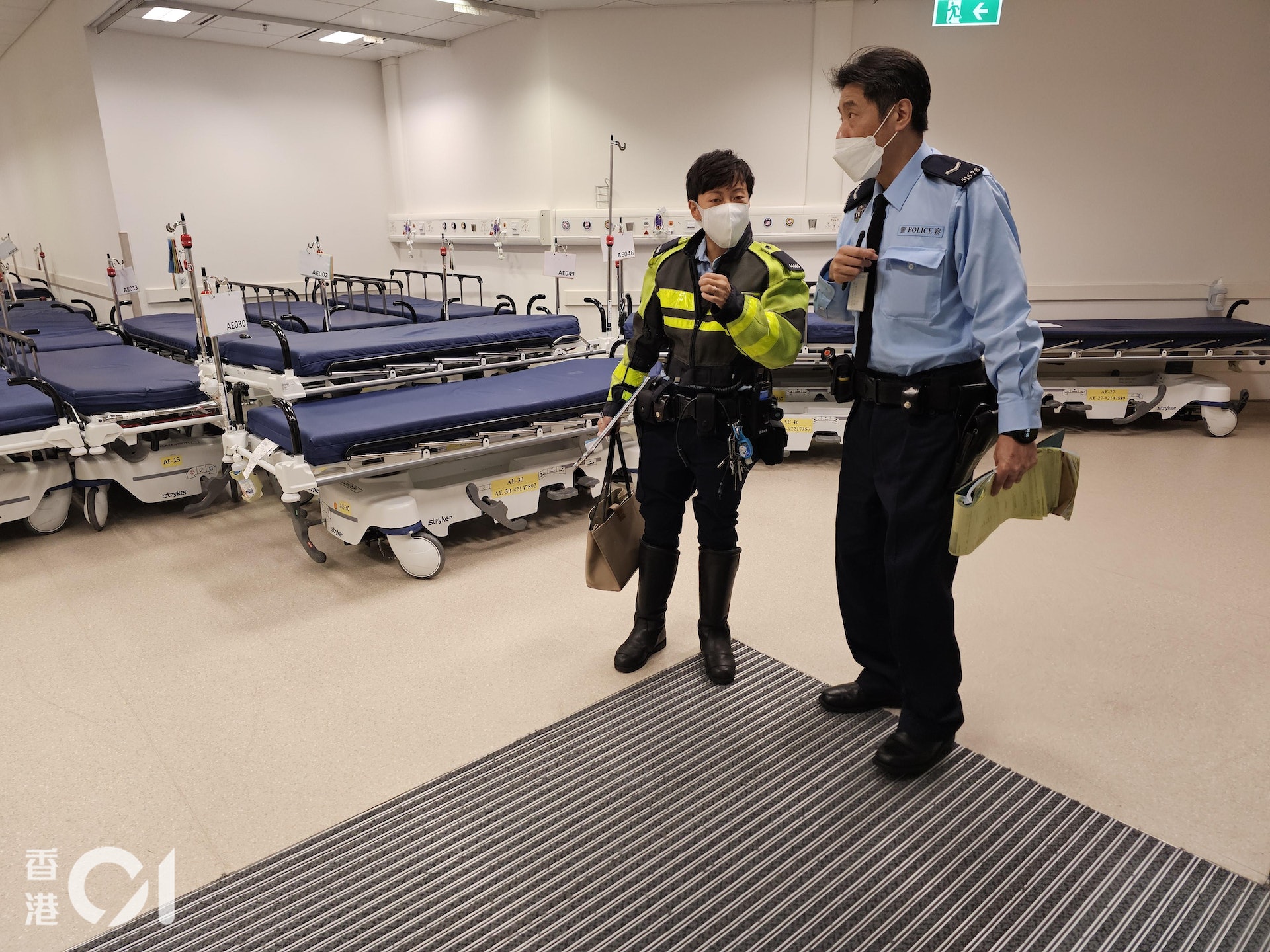 ) O& C, Y+ I5 s一名女子在觀塘駿業街與海濱道交界,遭一輛中型貨車撞到,昏迷送院,警員手持事主的手袋陪同她到醫院。(梁偉權攝)os.tvboxnow.com& x) d) E: b6 `% p9 g: ^' m1 T