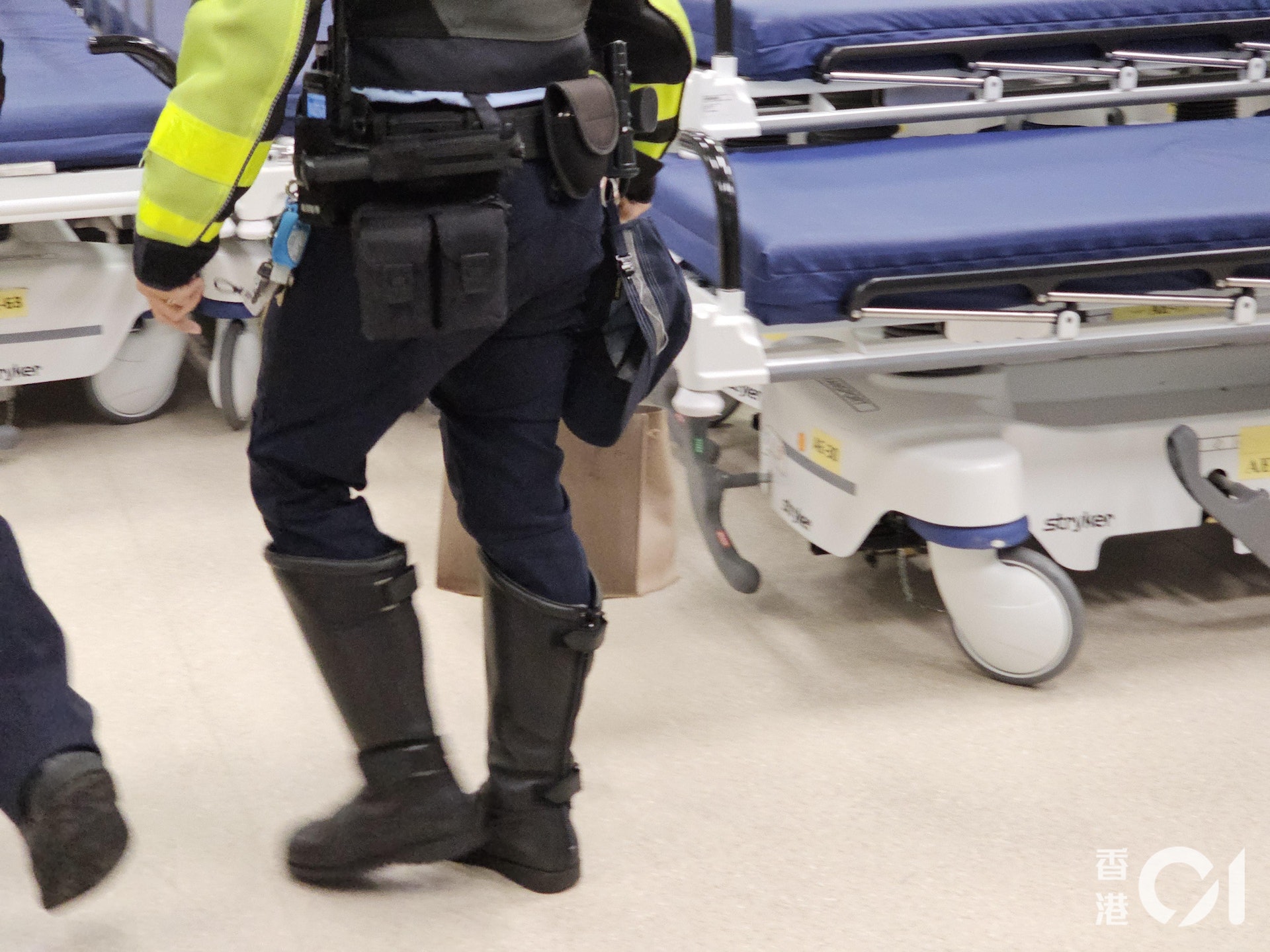 一名女子在觀塘駿業街與海濱道交界,遭一輛中型貨車撞到,昏迷送院,警員手持事主的手袋陪同她到醫院,手袋上沾有血漬。(梁偉權攝) |