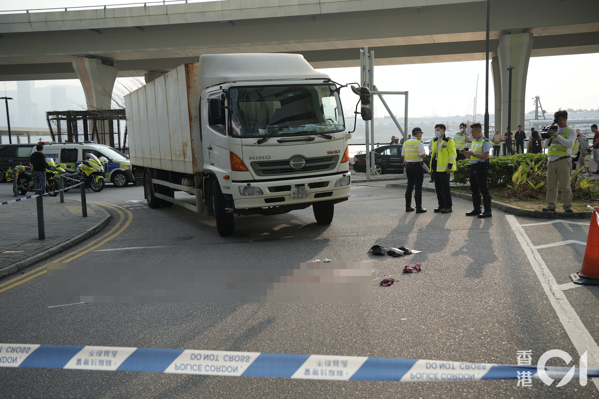 一名女子在觀塘駿業街與海濱道交界,遭一輛貨車撞到,昏迷送院,現場地面遺下頸巾等物件,並有大灘血迹。(左朗星攝)tvb now,tvbnow,bttvb+ L5 V, a: f4 h9 I; l0 @( J. F