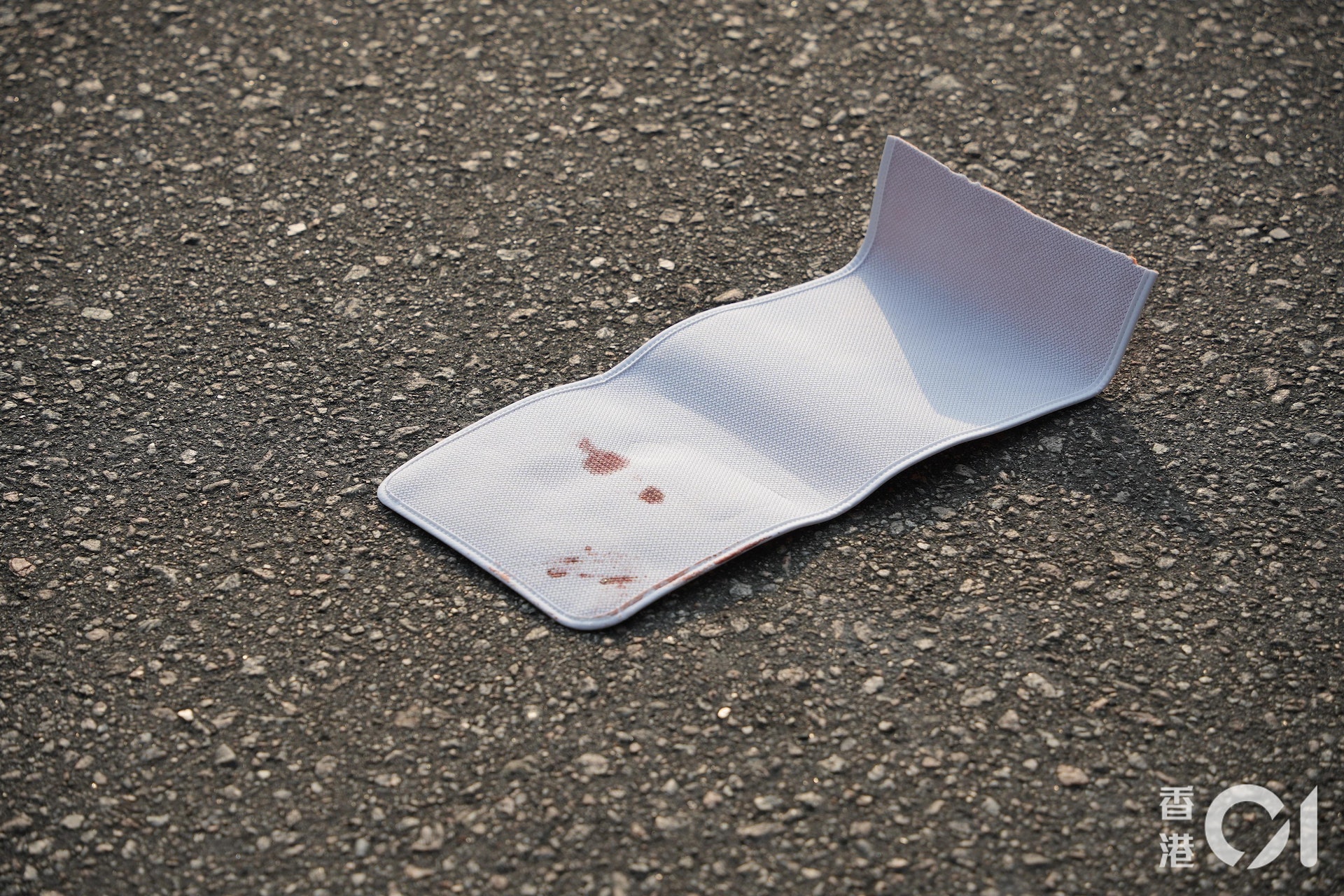 一名女子在觀塘駿業街與海濱道交界,遭一輛貨車撞到,昏迷送院,現場地面遺下染血頸巾等物件,並有大灘血迹。(左朗星攝)