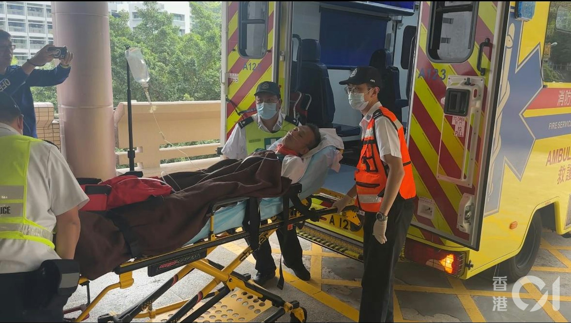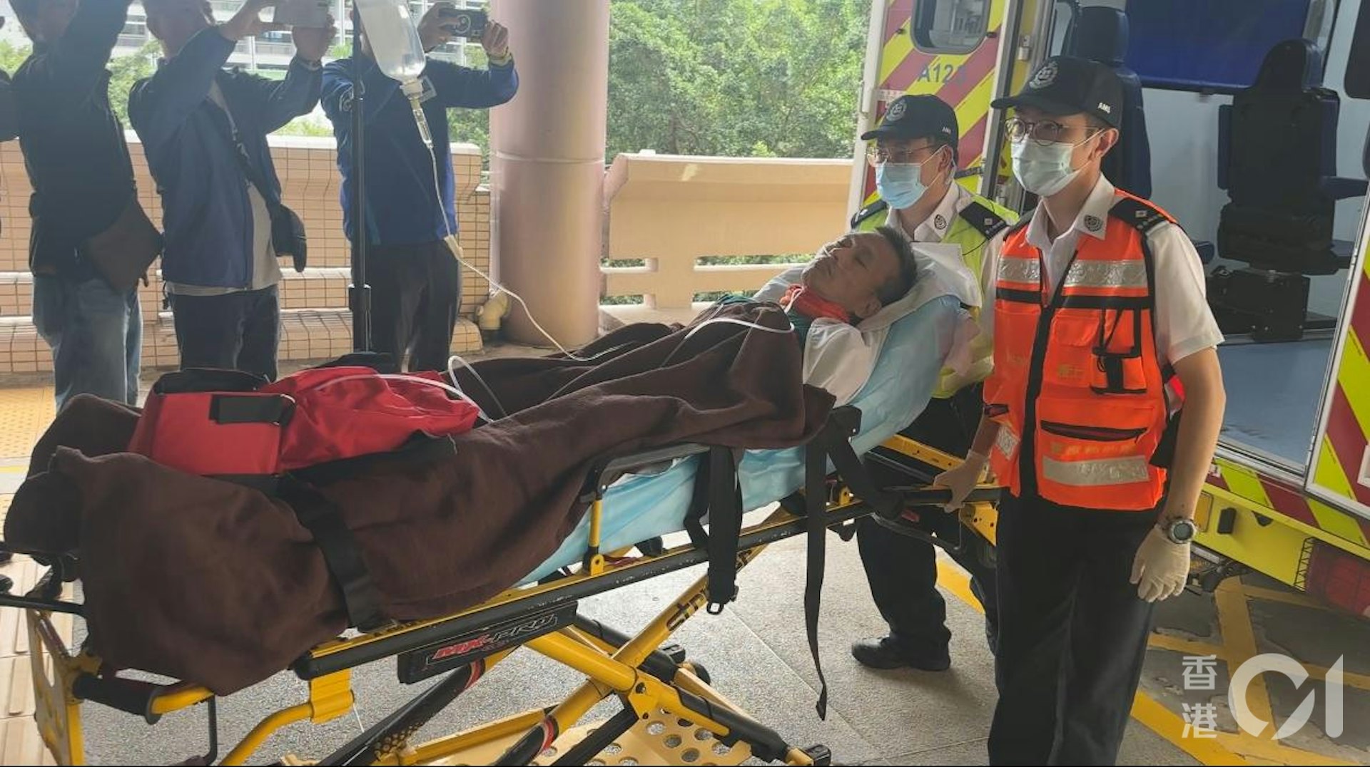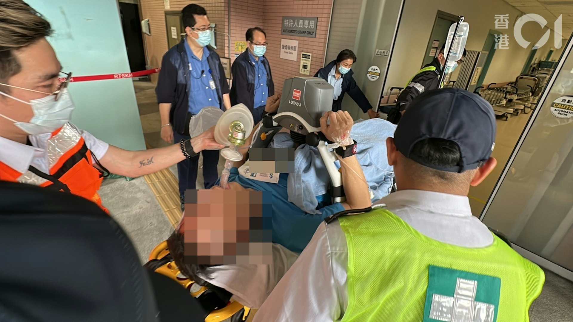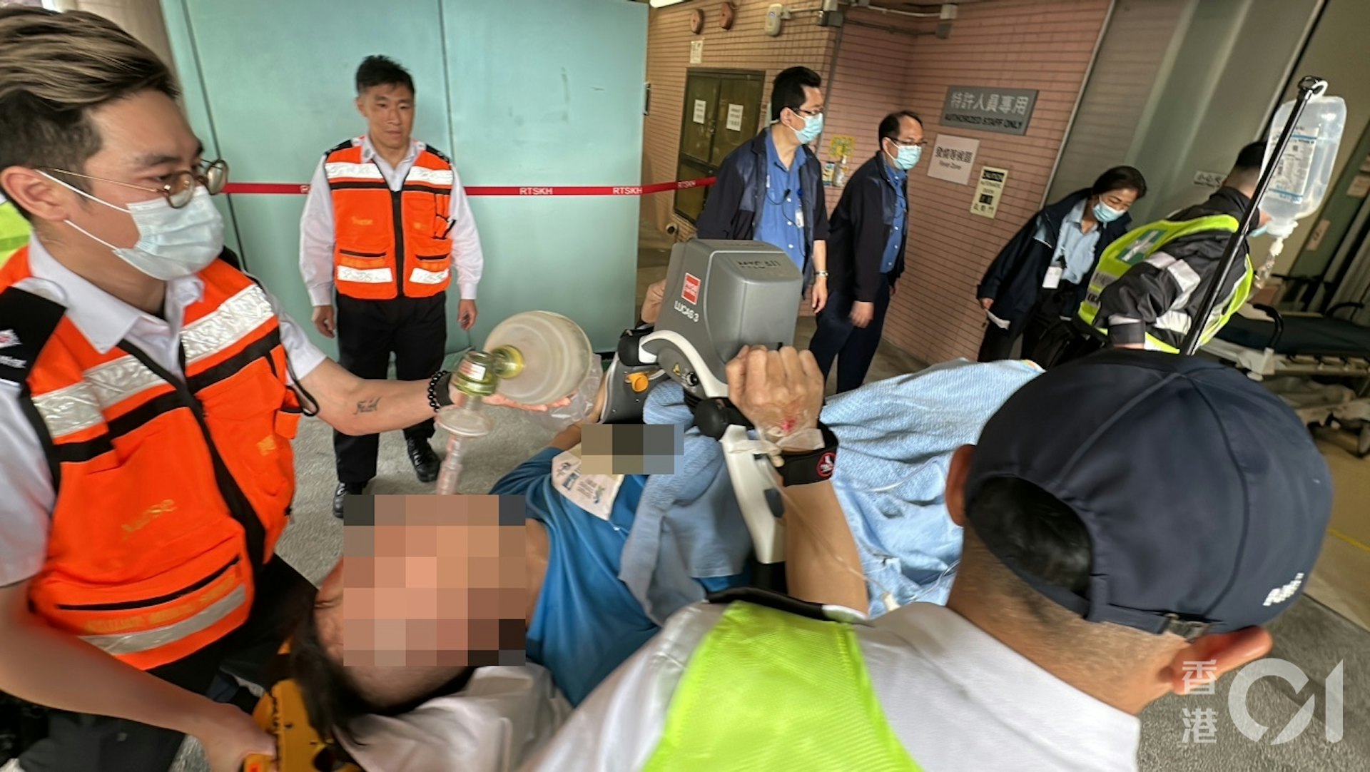 受傷跑手由救護車送往律敦治醫院救治,當中一名昏迷男子由醫療輔助隊送院,需要施用自動心外壓機,並戴上氧氣罩協助呼吸。(馬耀文攝)