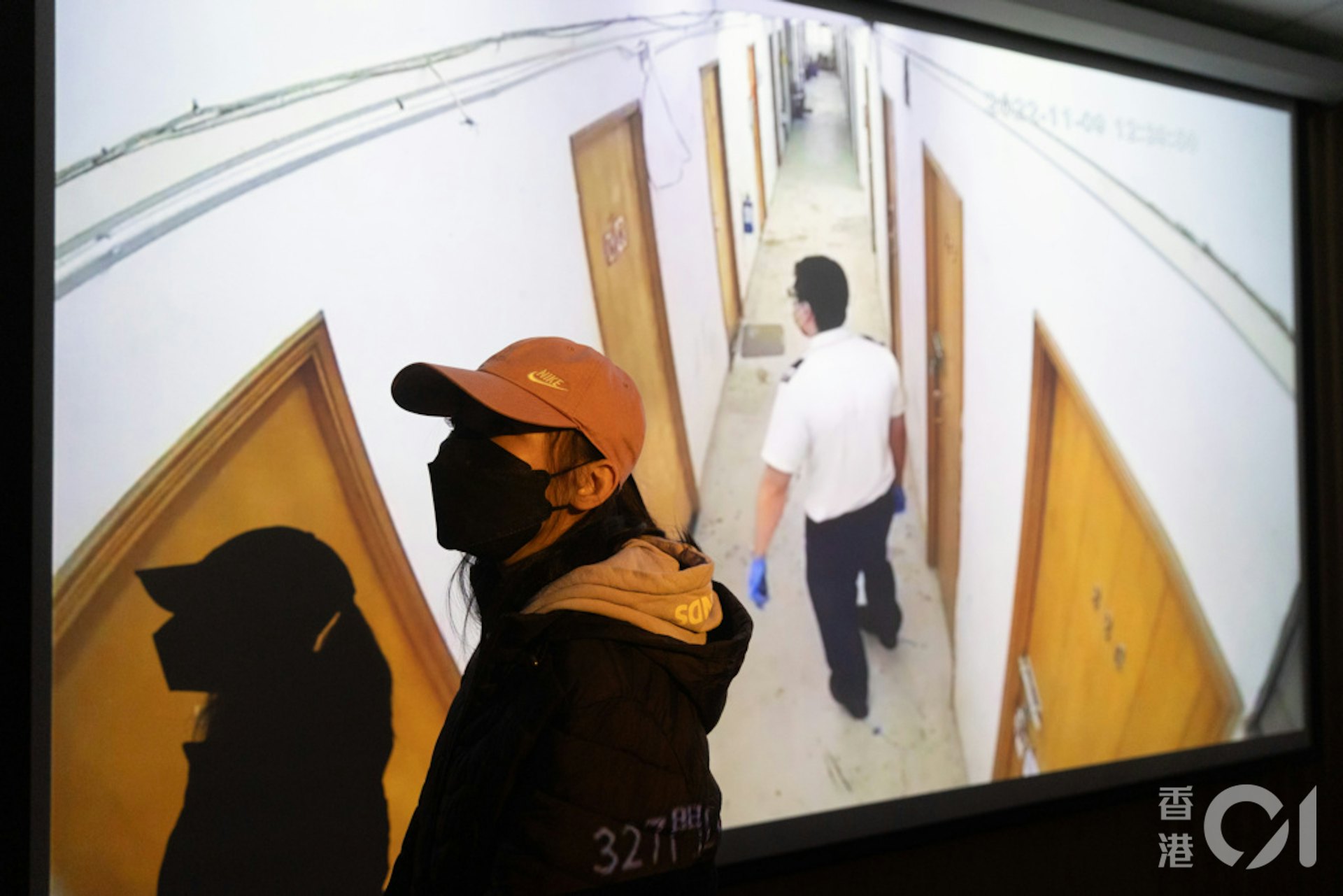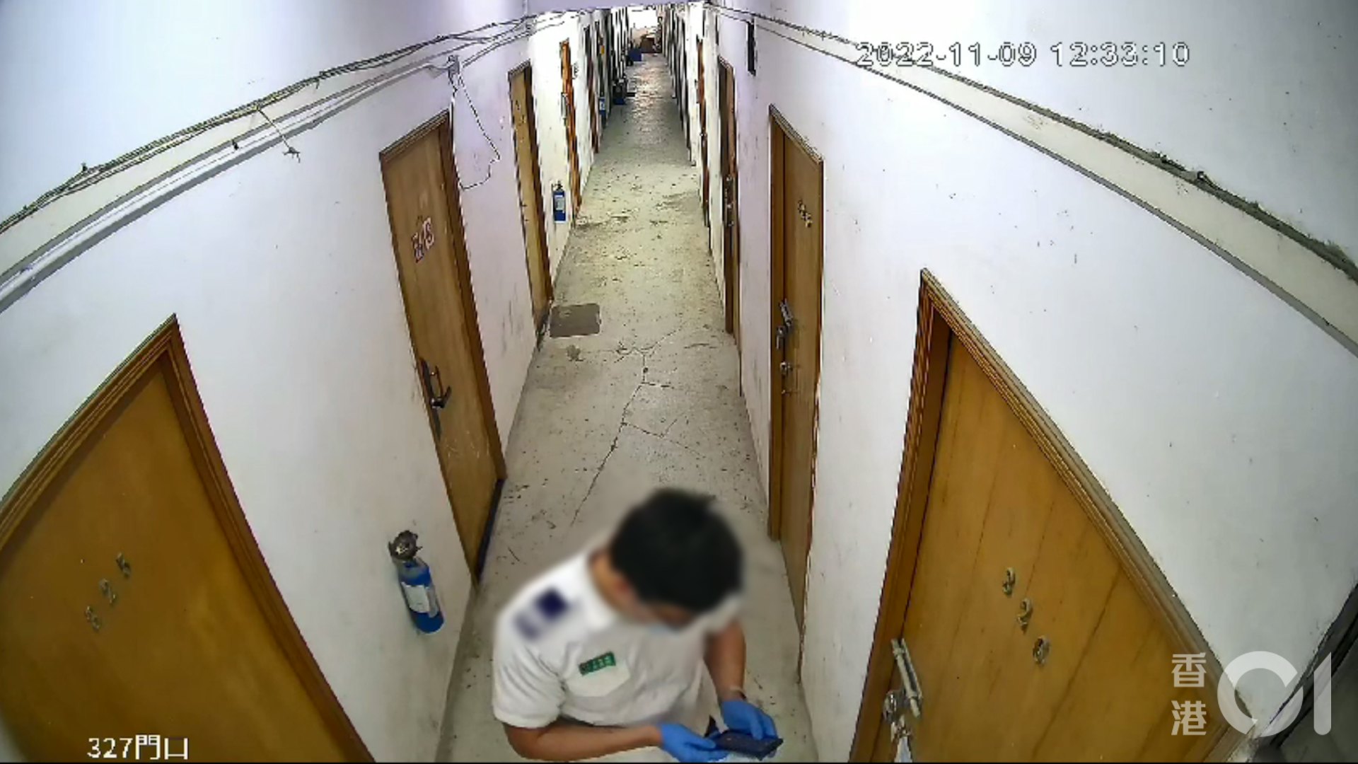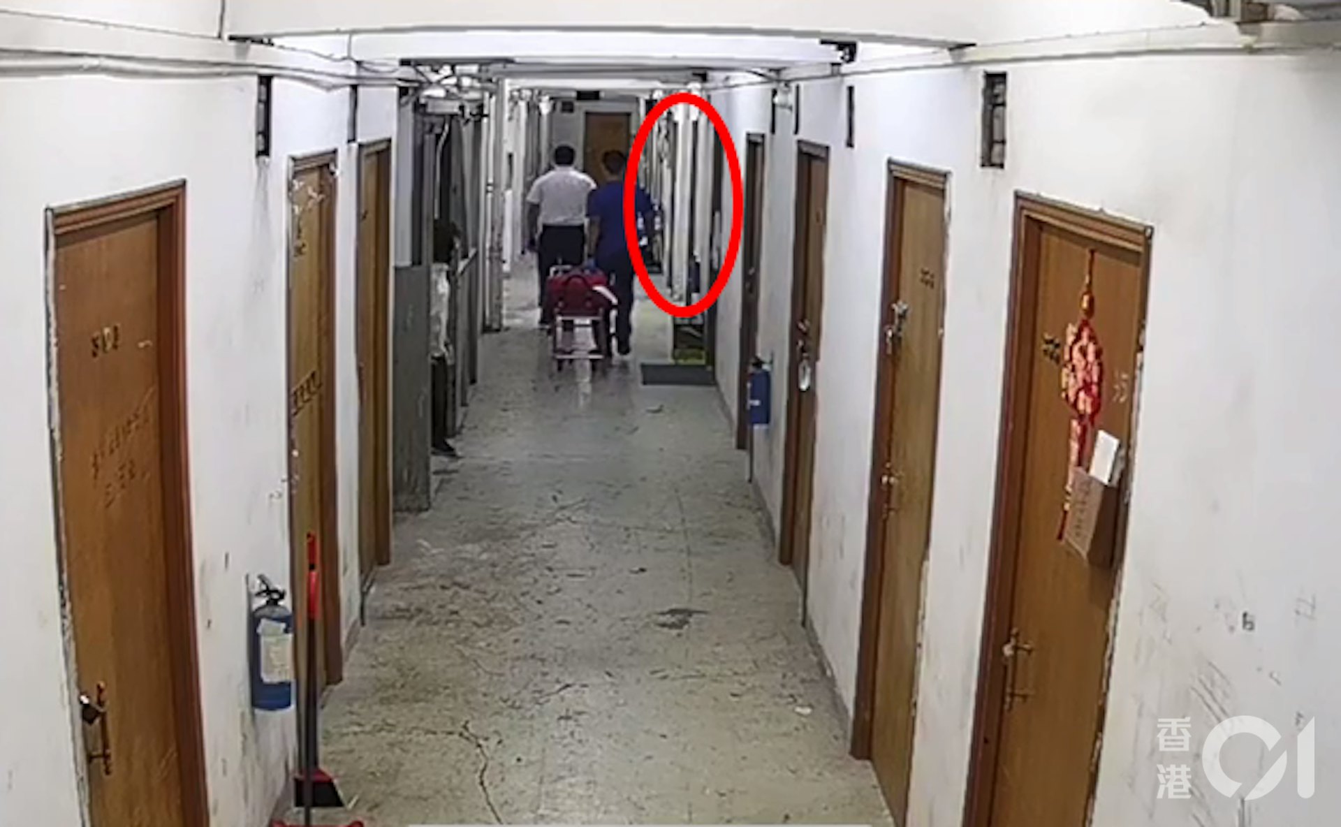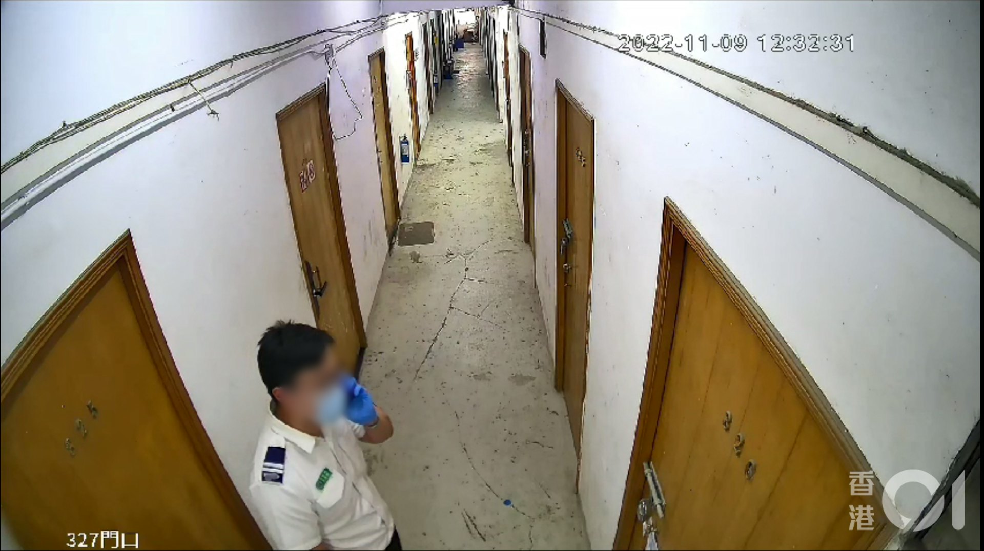 0 d2 Y! v1 `; h P' e8 q6 L9 X閉路電視片段顯示,救護員到達326室門前,曾敲門及打電話。(閉路電視片段截圖)