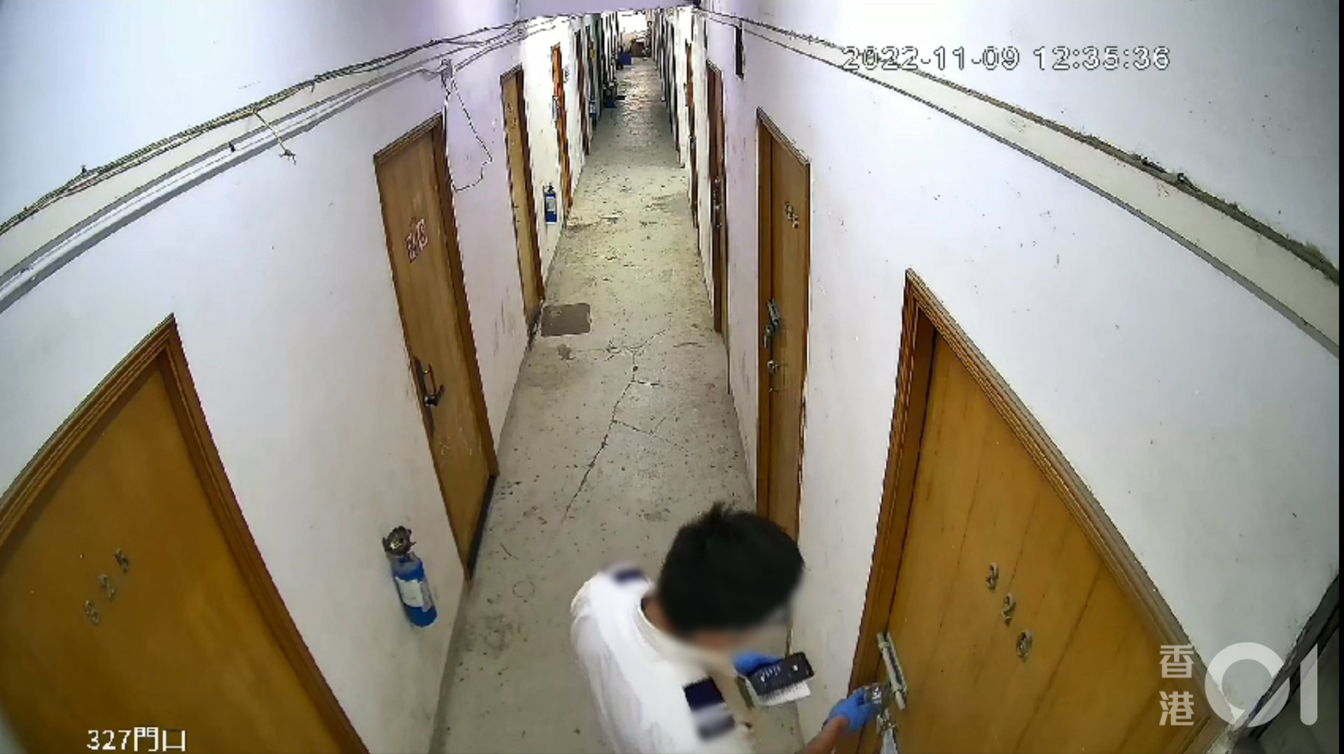 ! v* t. I5 h$ N9 Q9 _: \& ?閉路電視片段顯示,救護員到達326室門前,發現門外有鎖從外鎖上。(閉路電視片段截圖)
