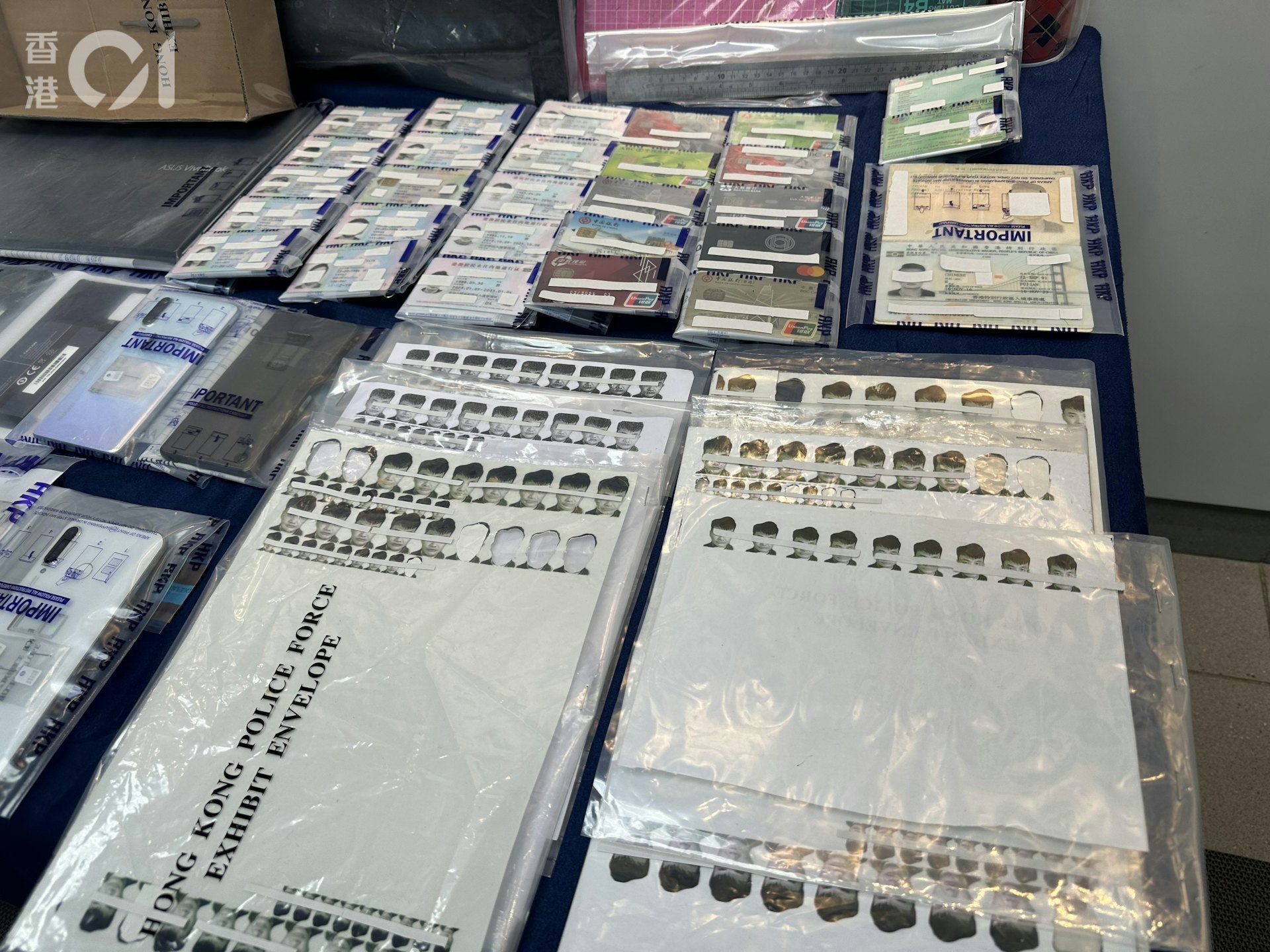 1 w/ _% {2 v1 Y2 s1 p( D+ @tvb now,tvbnow,bttvb警方檢獲28張屬於他人的身份證明文件及銀行卡、一批製作工具、以及多張印有不同尺寸證件相頭像的貼紙,相信用作轉換身份證頭像。(王譯揚攝)公仔箱論壇' y5 O( Q8 P" q* f$ v