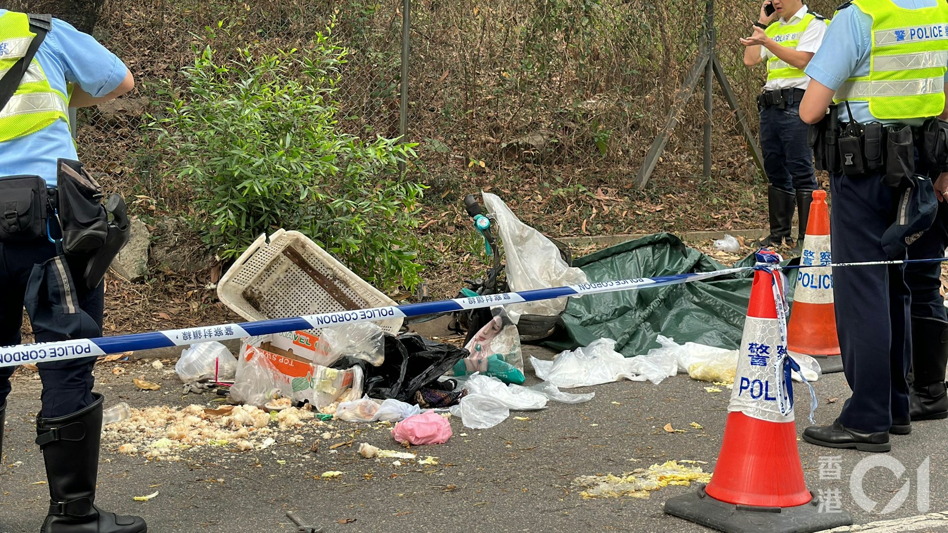 % O9 D. i( [, e0 D; b單車前後均裝上籃子,內裡雜物四散地面,包括外賣飯盒、食物、蔬菜及膠袋。(黃煦緻攝)