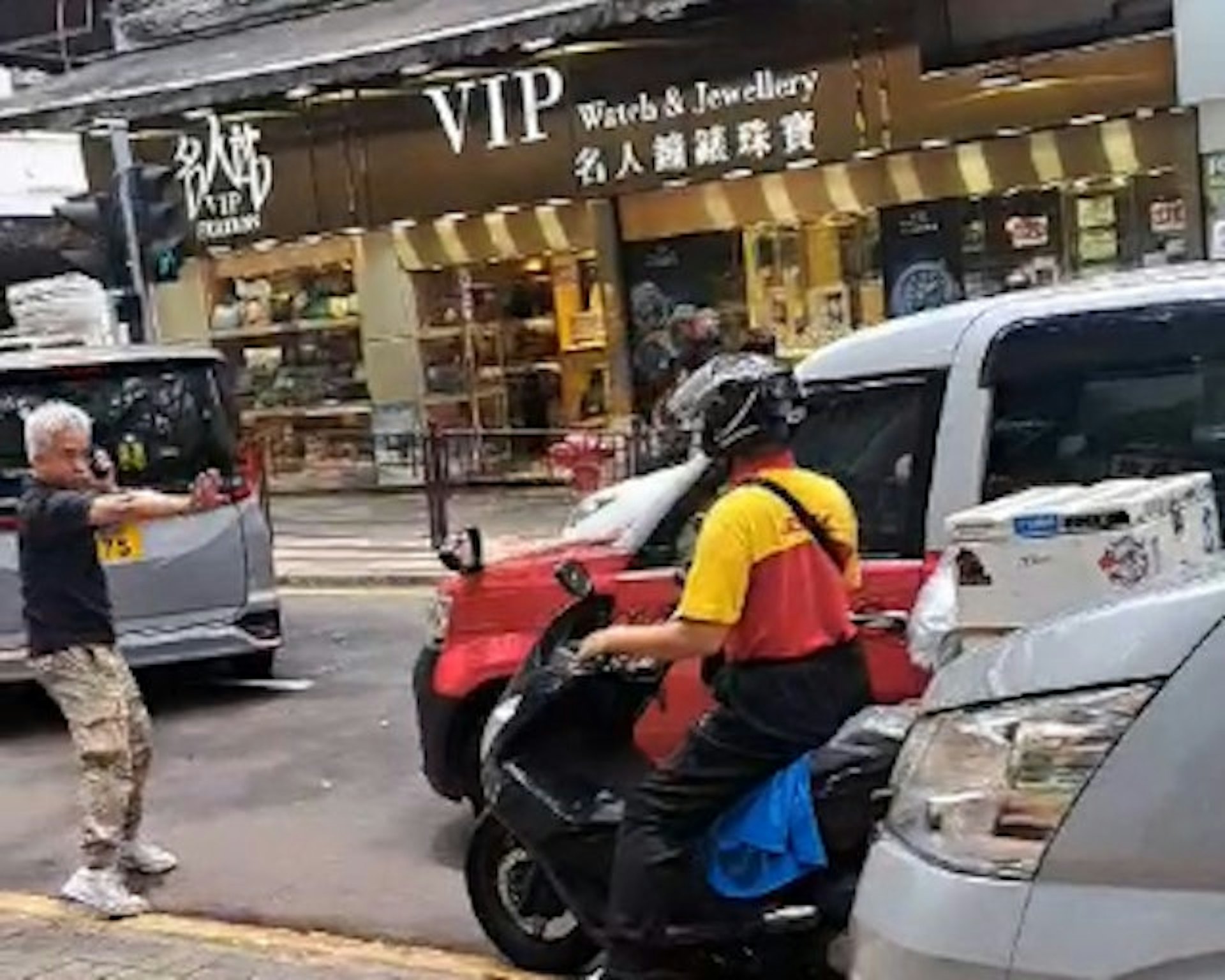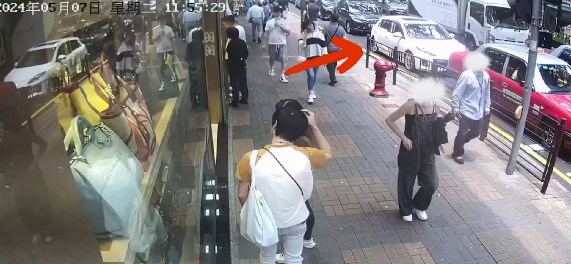 / o9 j. ~7 K- ^* Y/ Z! w( v涉案白色私家車停於目標店舖對開海防道。(名人鐘錶珠寶閉路電視片段截圖)& v8 p7 j# z/ ~
