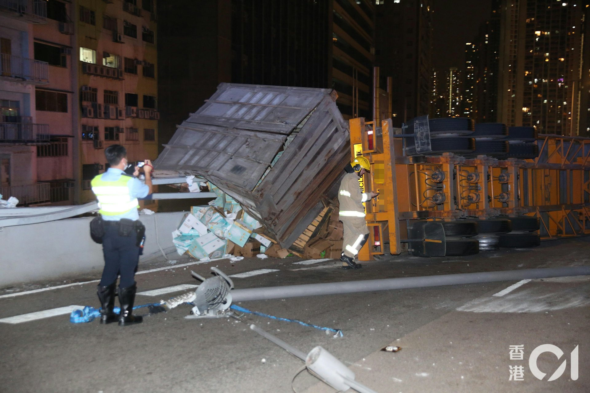 消息稱,涉事貨櫃車在荃灣路柴灣角熟食市場對開一個右彎時已經出事,先撞向左邊石壆和鐵欄,撞斷一支燈柱飛墮橋底地面,相信車頭削開,令到司機飛出車外拋落橋底,餘勢未了,貨櫃車在無人駕駛的情況下繼續衝前約200米,撞向有線電視大樓對開路中石壆翻側,再掃毀4支燈柱。
