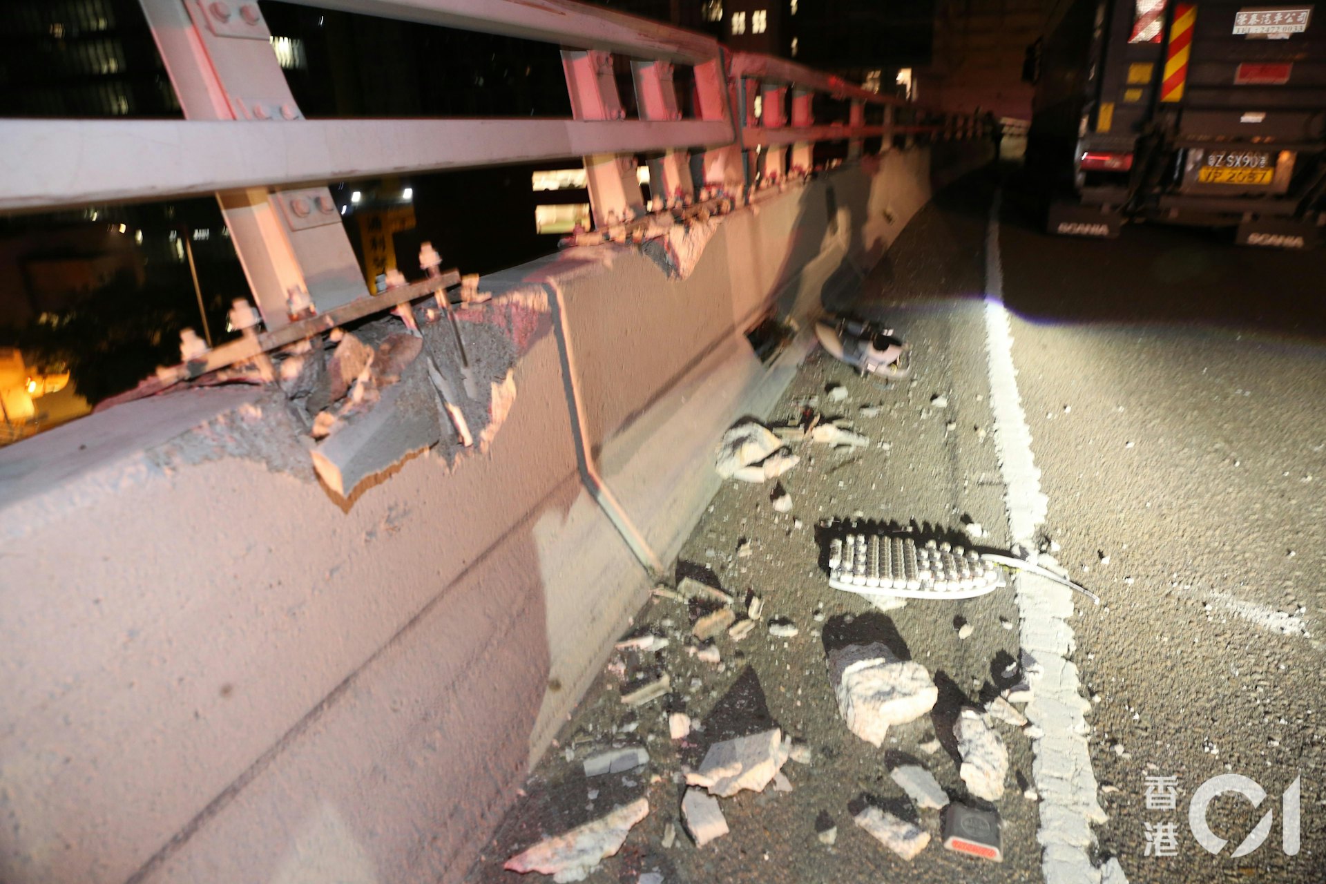 5 Q8 ?4 A7 e0 M# L. i現場可見,橋面和橋下一片狼藉,包括荃灣路兩邊行車線,多支燈柱被掃毀,部份燈柱橫亘橋面路中,貨櫃車車頭連同駕駛室嚴重損毀,貨櫃尾部被劏開,擱在天橋欄杆上,貨櫃車零件和大批尿片散落一地,石壆遭到撞毀,碎石四散一地。