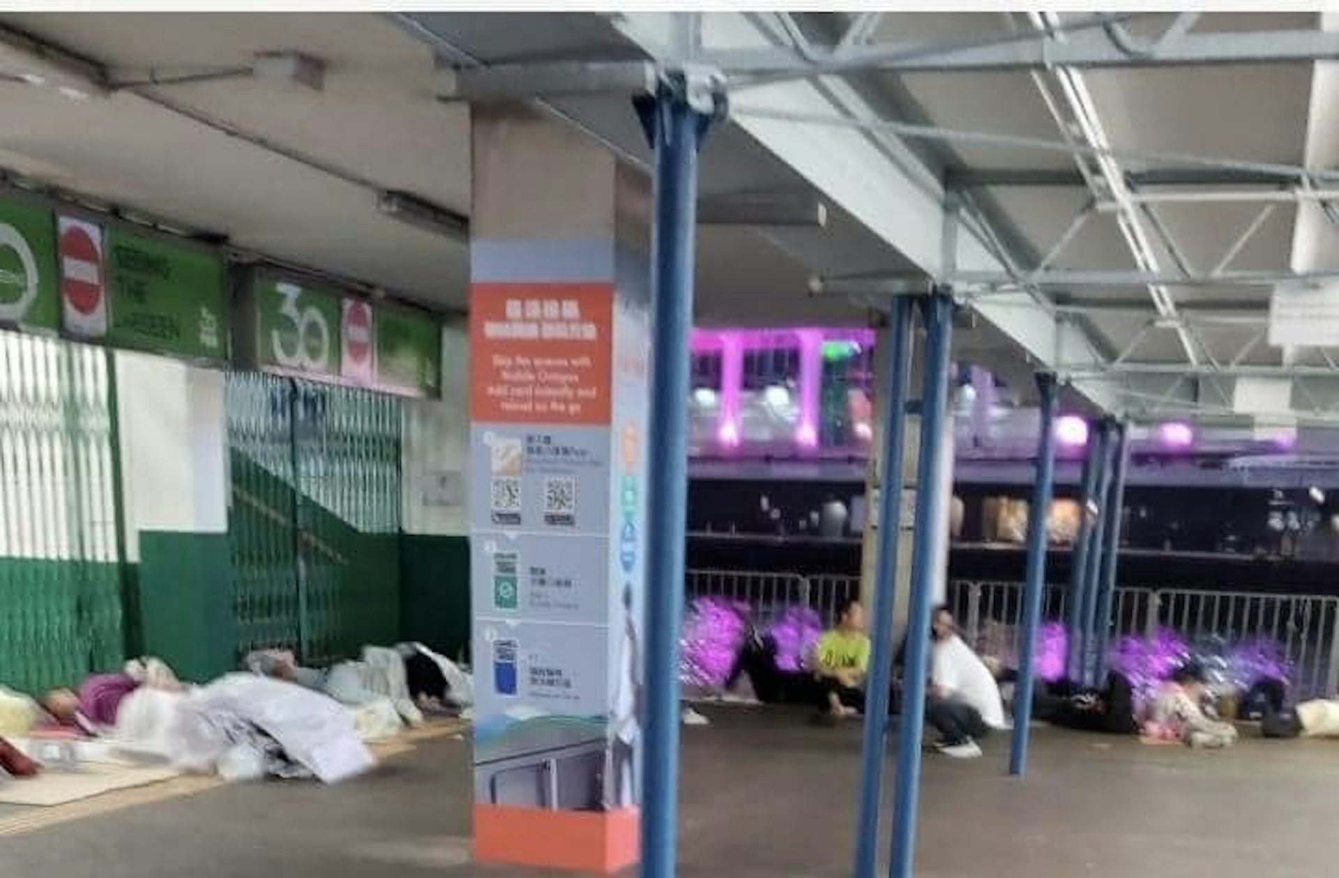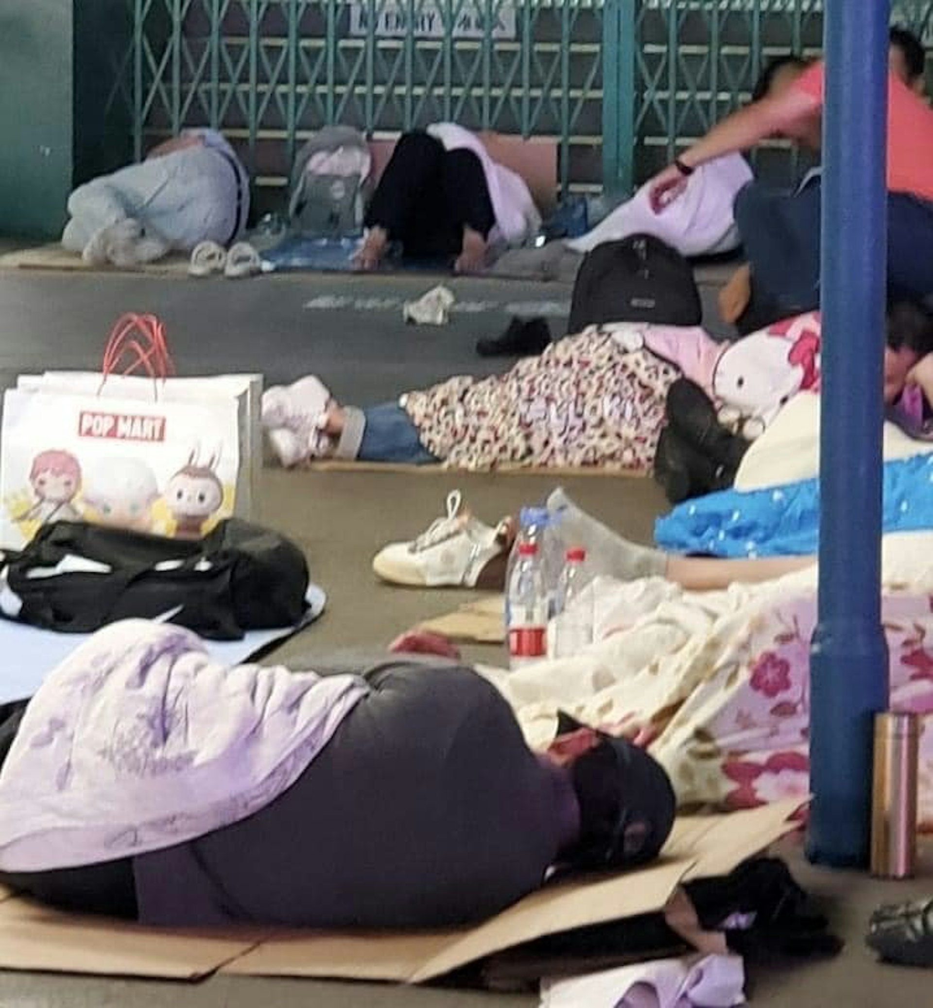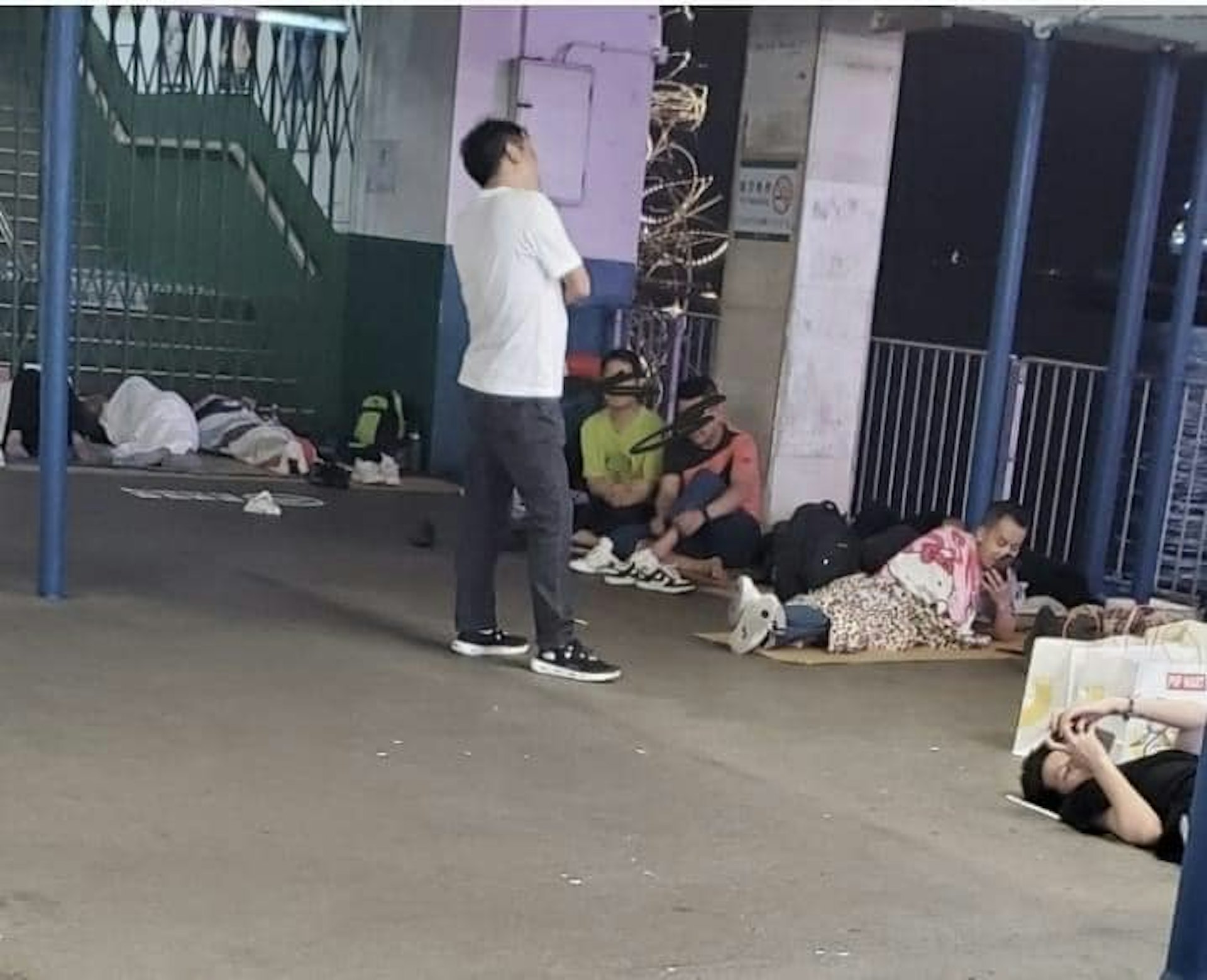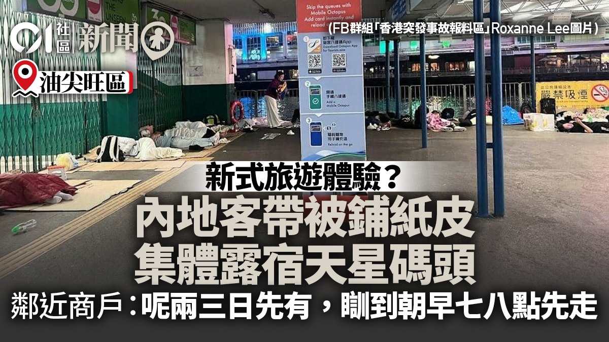 , K% @4 d( G; B; g+ {有網民近日在尖沙咀天星碼頭發現一批內地客深夜露宿街頭,有人甚至自備被鋪和紙皮,場面相當誇張。(香港突發事故報料區Facebook群組Roxanne Lee圖片)