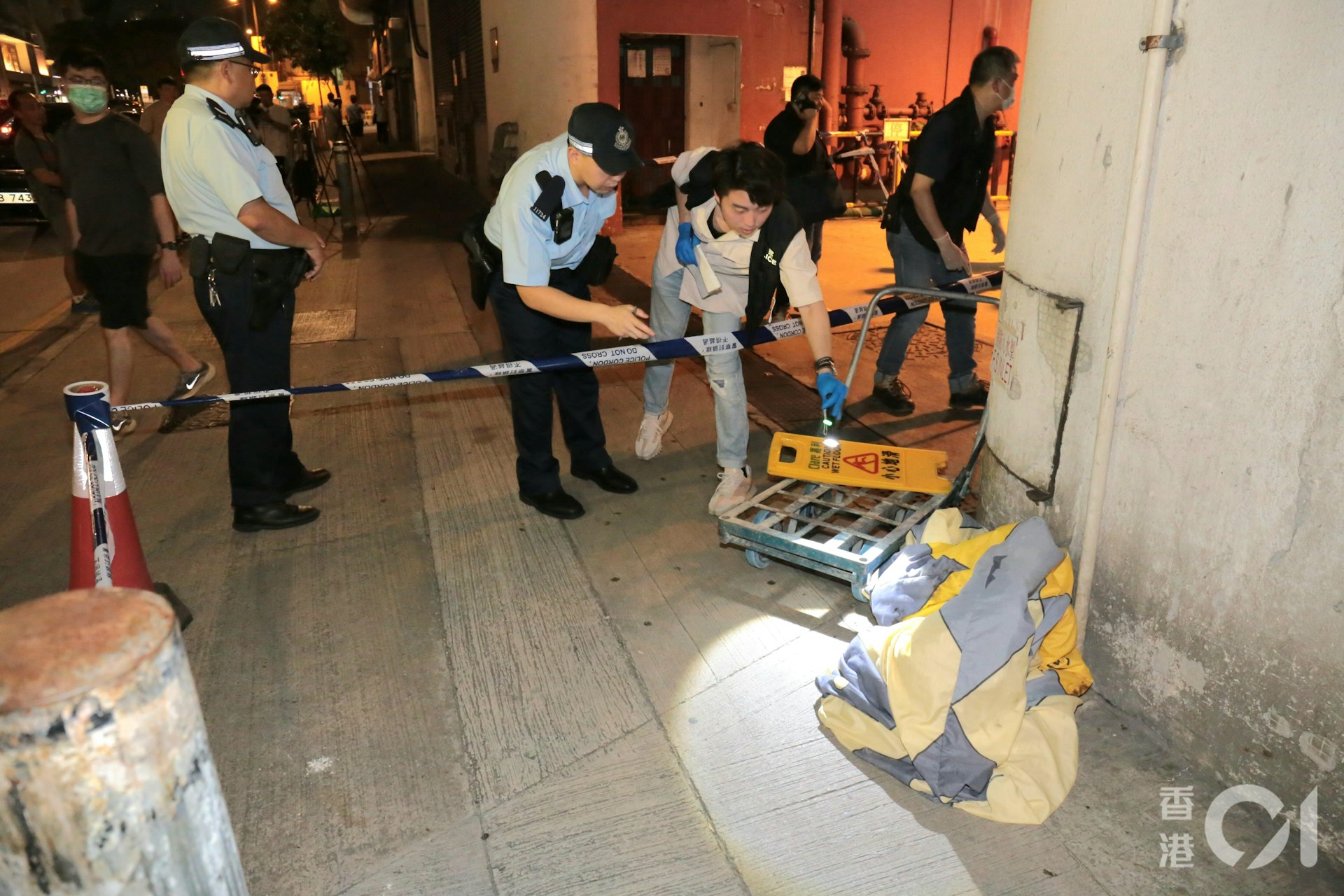 現場遺下手推車,探員套取指模蒐證。(梁偉權攝) |