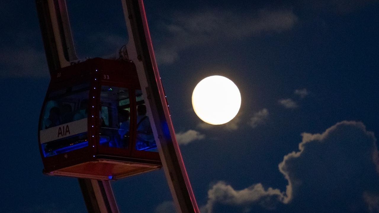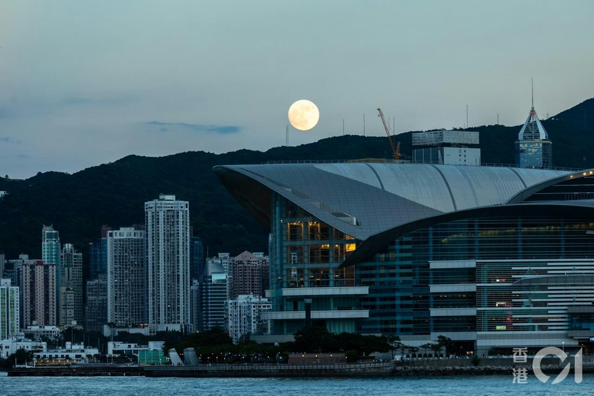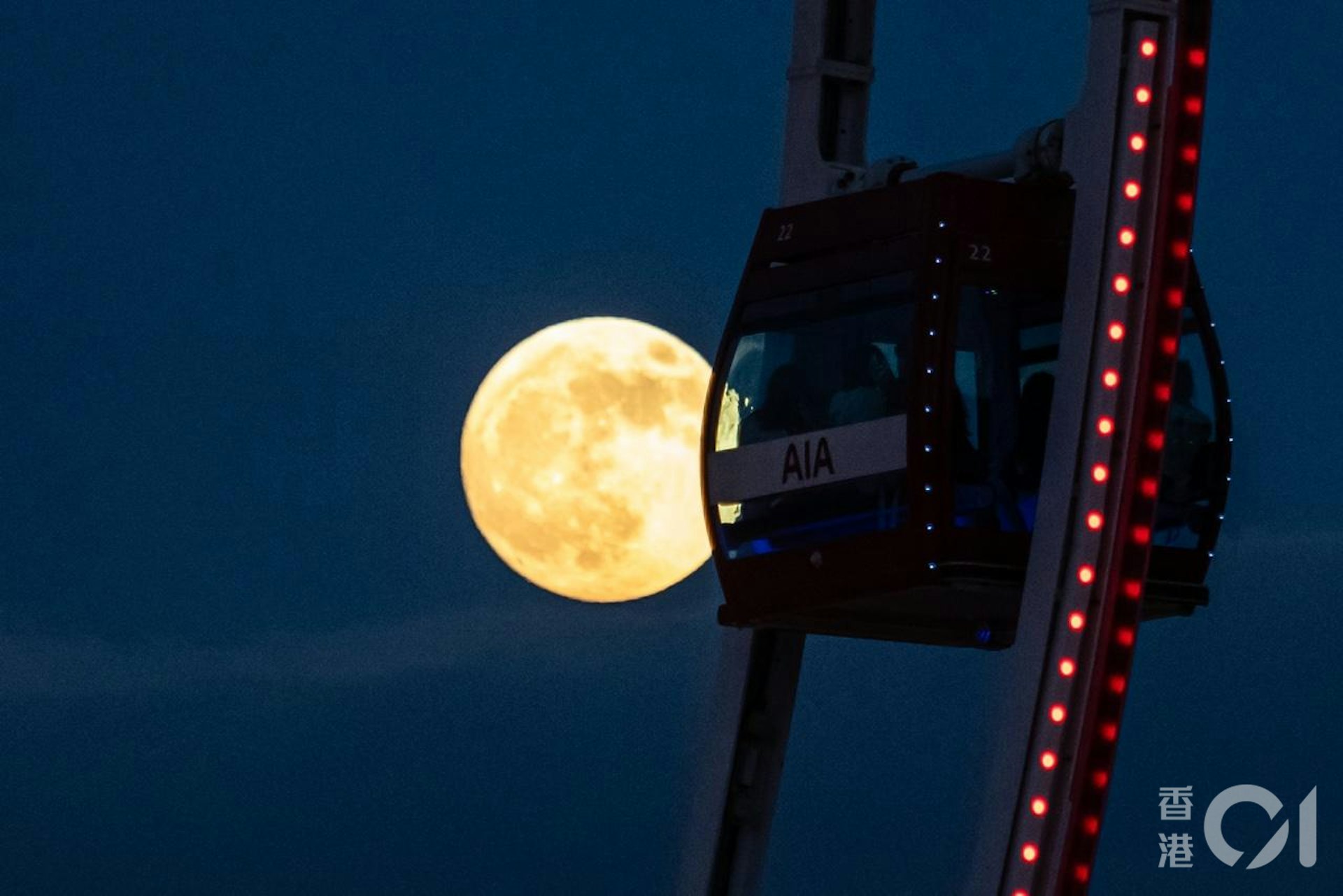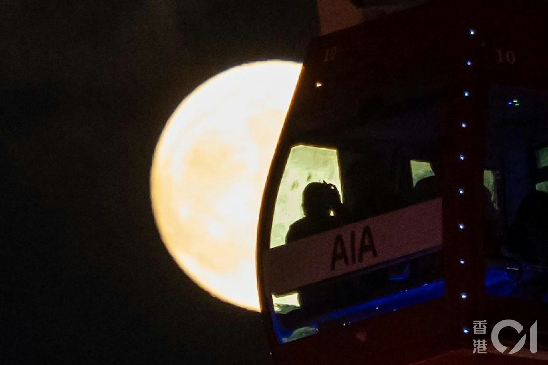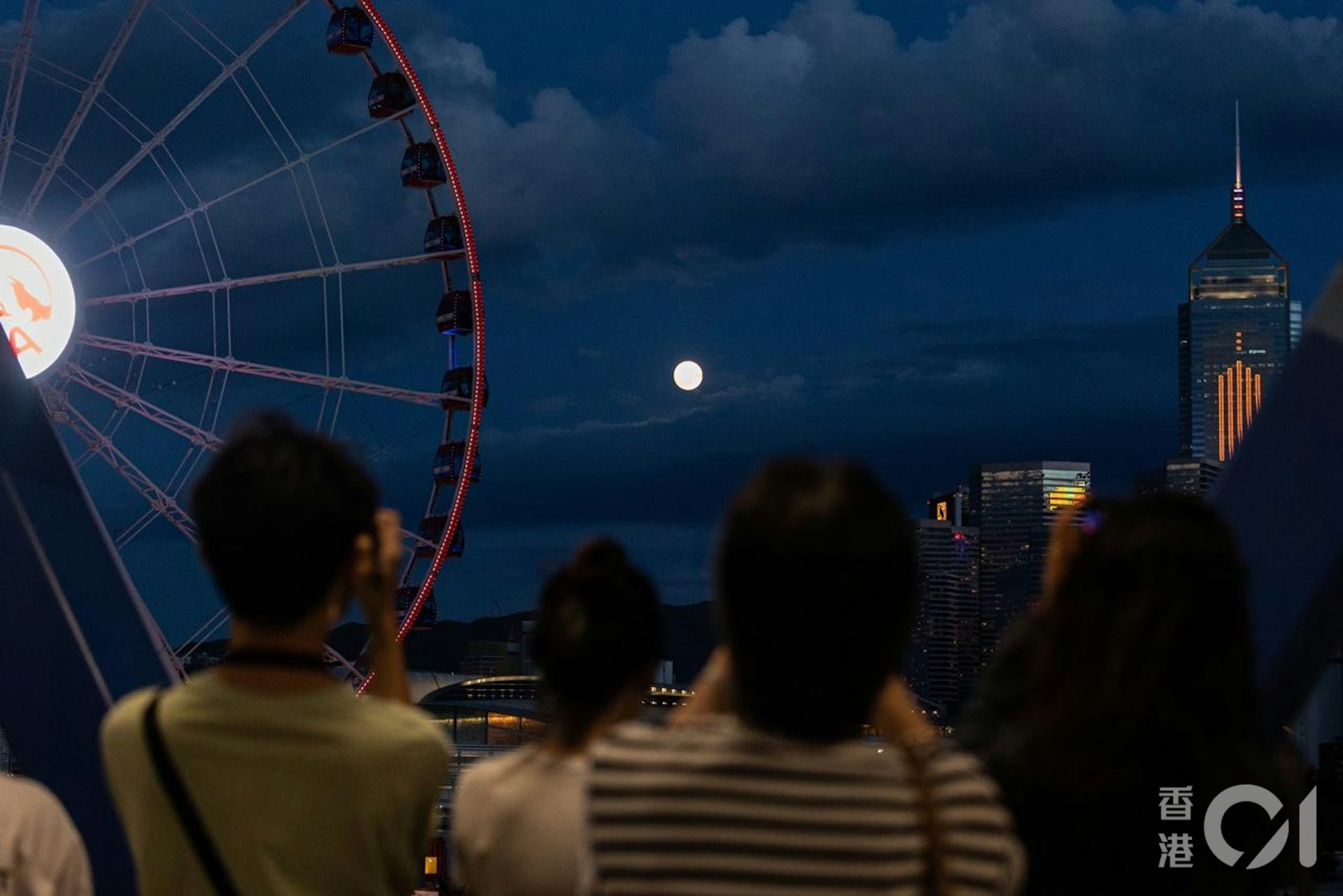中秋佳節人月兩團圓,中秋節夜傍晚(17日),中環海濱行人天橋人山人海,大批市民及旅客等待月出拍照。至黃昏近7時,月亮終於探出頭來,月亮與摩天輪互相襯托下,構成浪漫的場景。