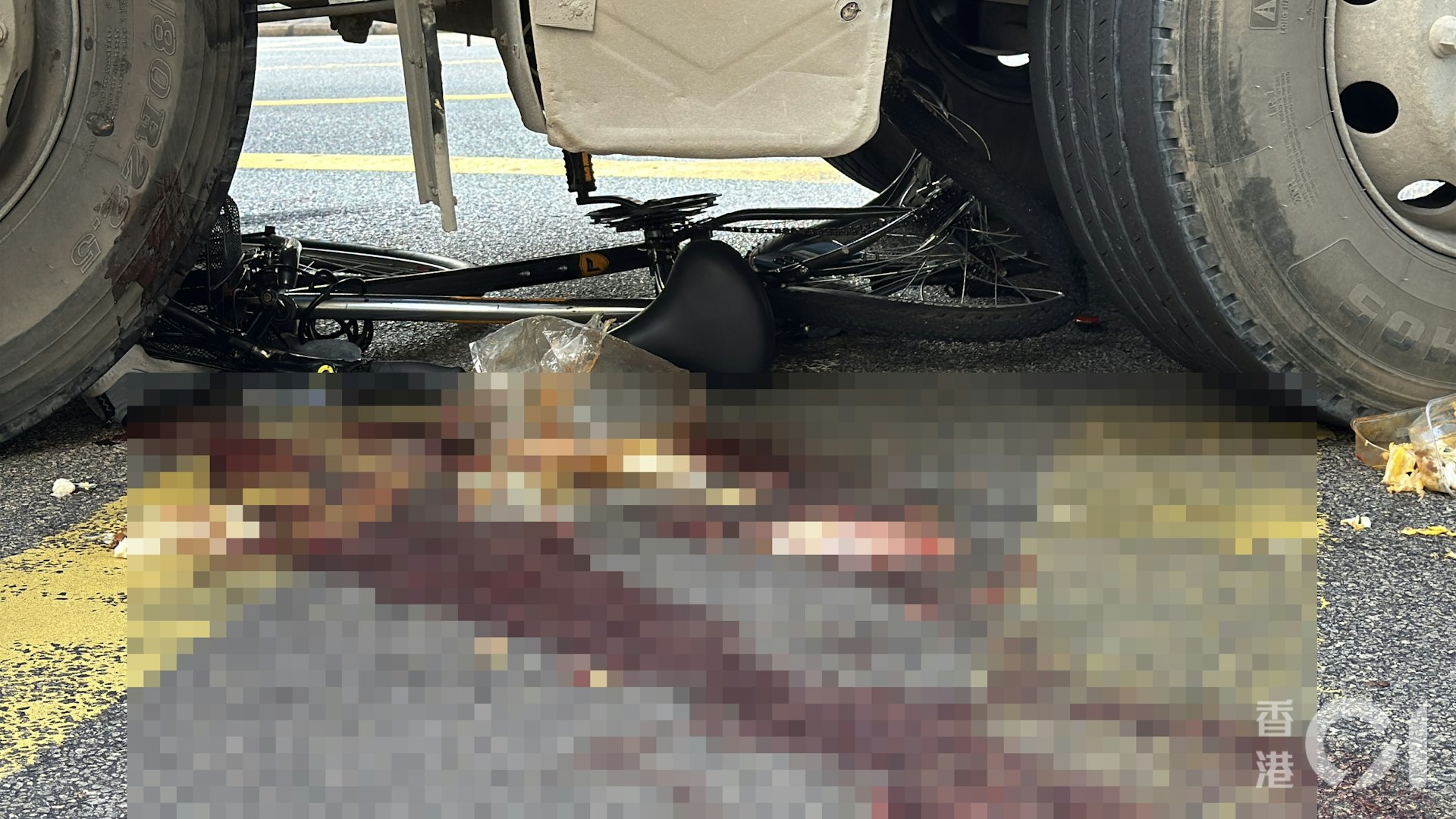 單車男被泥頭車撞倒後被捲入車底,其後獲救出倒臥於馬路,有途人為他撐傘。(fb 香港突發事故報料區/Bosco Chu)