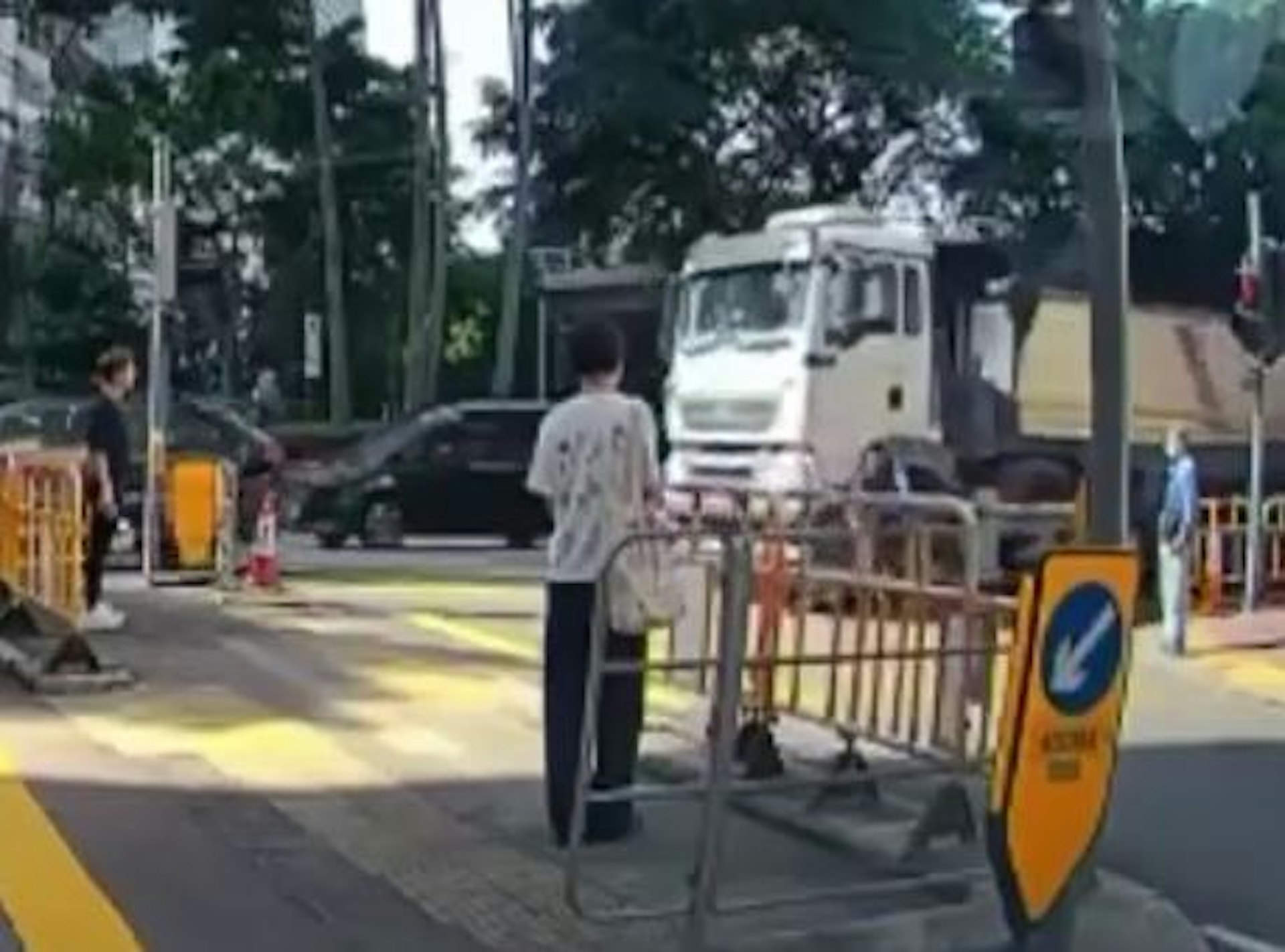 # q1 U' D5 C9 `- ?! Q( o泥頭車左轉時疑車身過高未有留意旁邊的單車,之後將其撞倒捲入車底,單車男下半身則被輾過嚴重受傷。(影片截圖)