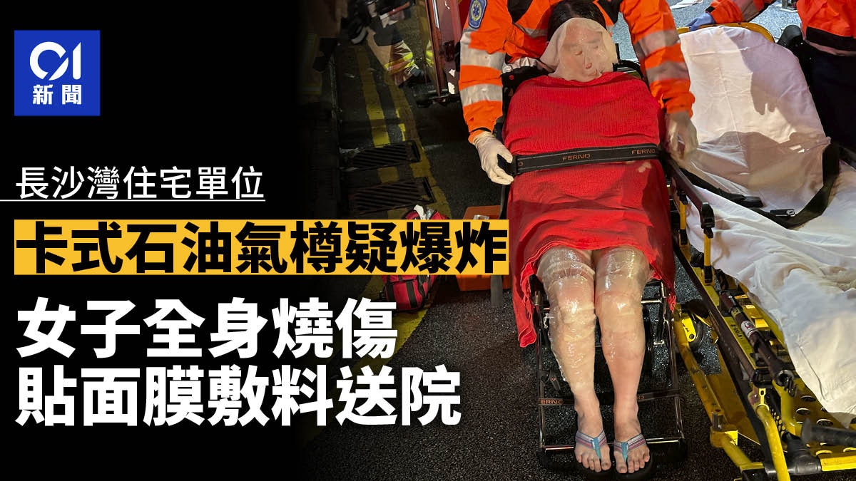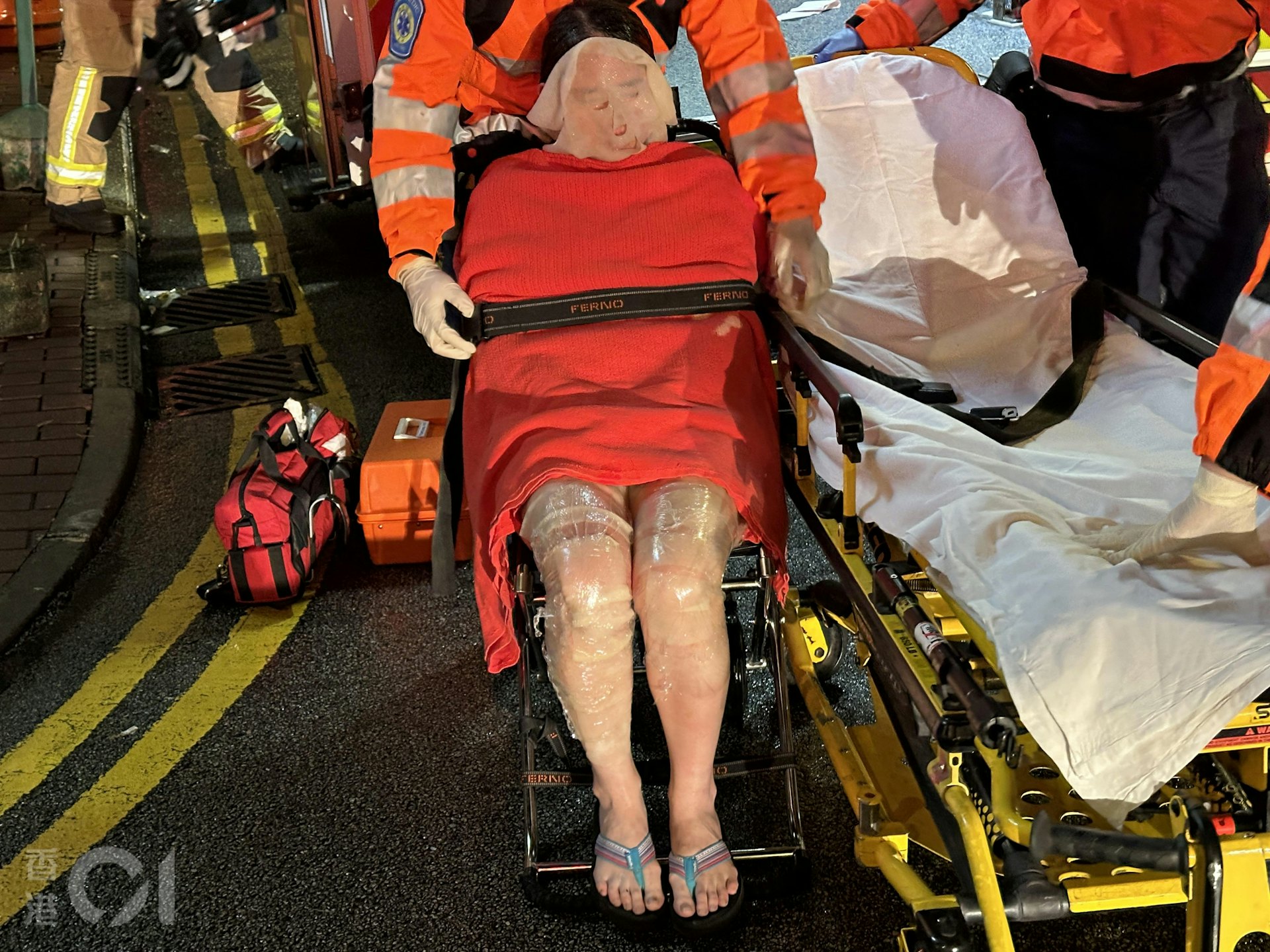 長沙灣耀輝大廈疑有卡式石油氣樽爆炸,女傷者送院時全臉貼上面膜、雙腳亦貼上大量敷料。(王譯揚攝)