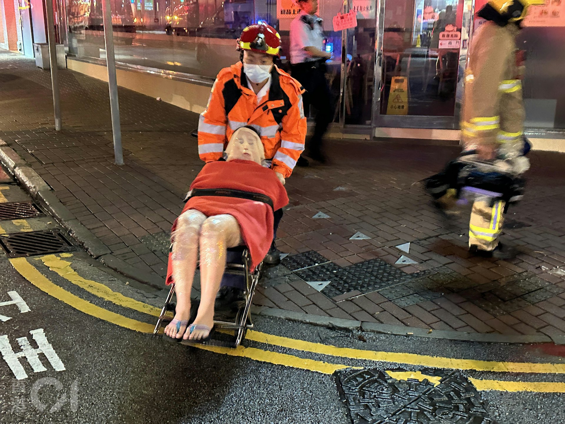 長沙灣耀輝大廈疑有卡式石油氣樽爆炸,女傷者送院時全臉貼上面膜、雙腳亦貼上大量敷料。(王譯揚攝) |