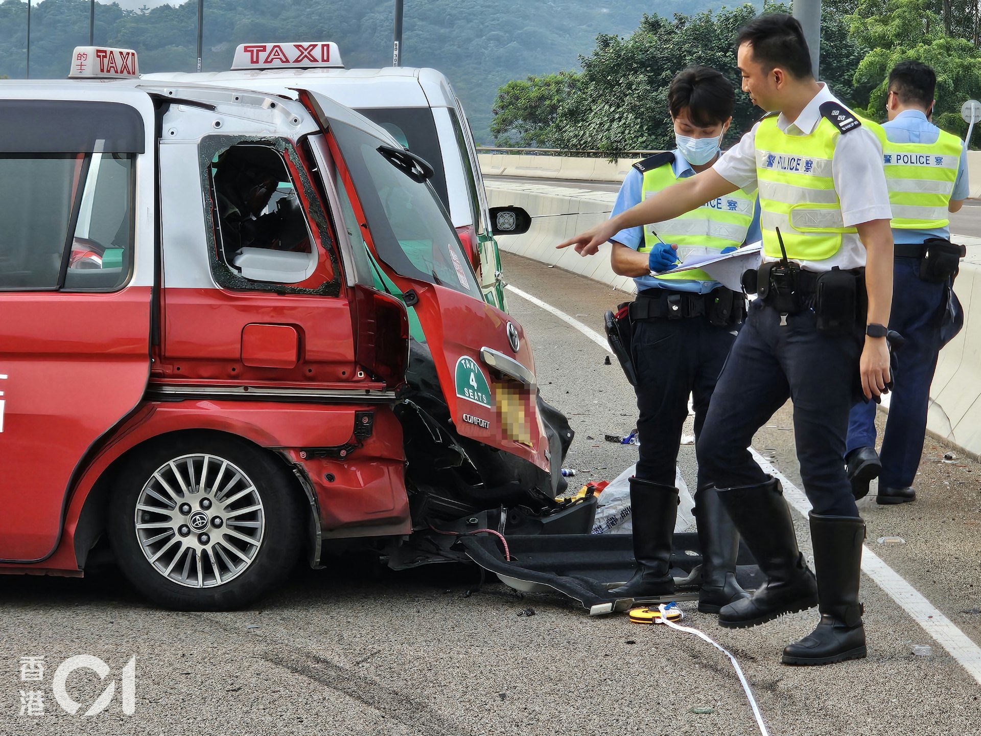 5 e1 s, I4 ]' H# J( r8 Q公仔箱論壇港深西部公路發生嚴重車禍,其中一架的士車尾嚴重損毀。(梁偉權攝)