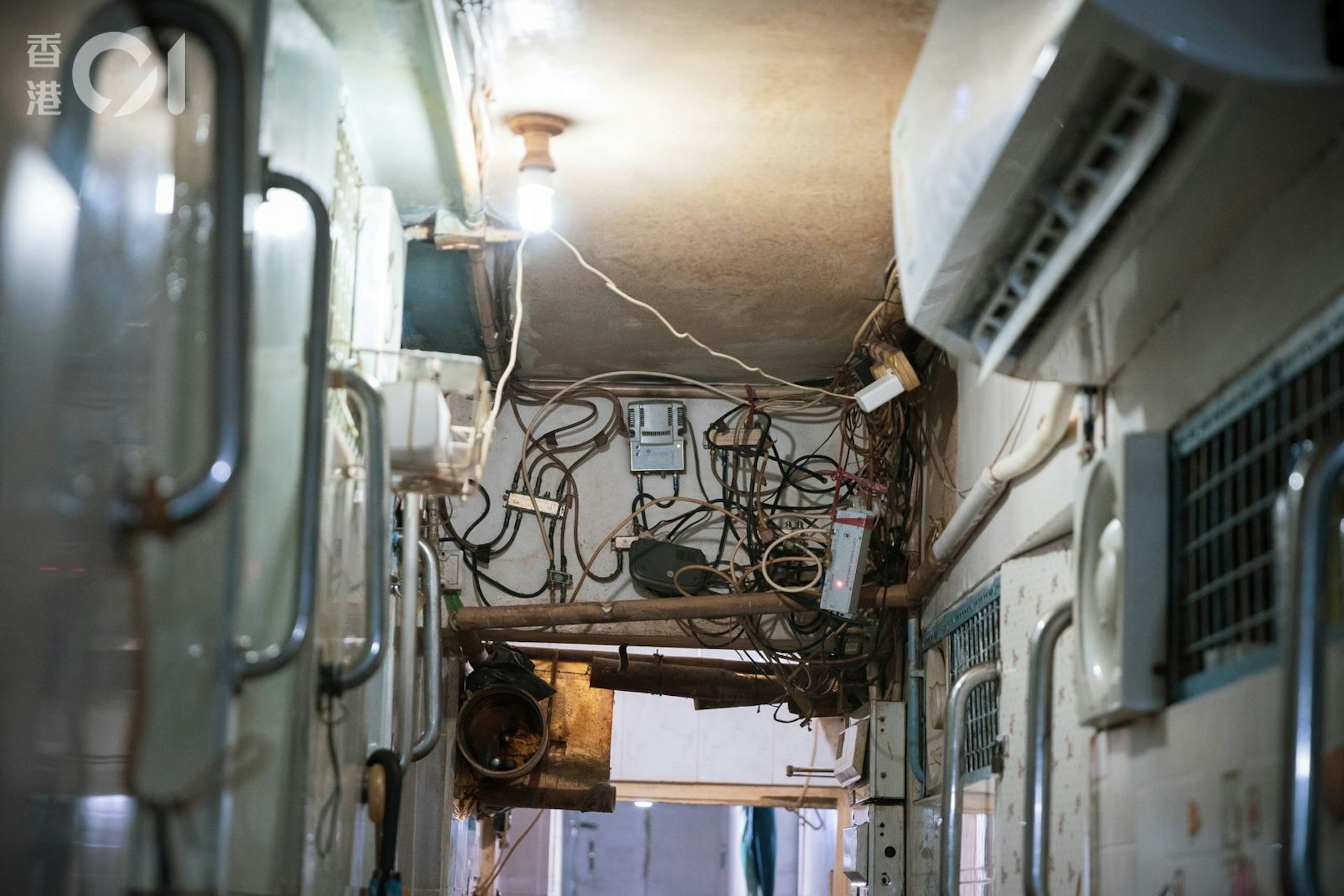 經過一扇扇門、一道道爬梯,在窄長走廊盡頭,是他們的「家」。這單位在旺角一棟唐樓,一劏就是26伙,牆上電線纏繞成幾團,拖板半天吊。住在這裏的區女士,盡用所有空間,在牆身掛衣服及一袋袋雜物,床邊的小雪櫃既用來儲物,也是小茶几。公仔箱論壇* s, m: c. h8 ^) E
