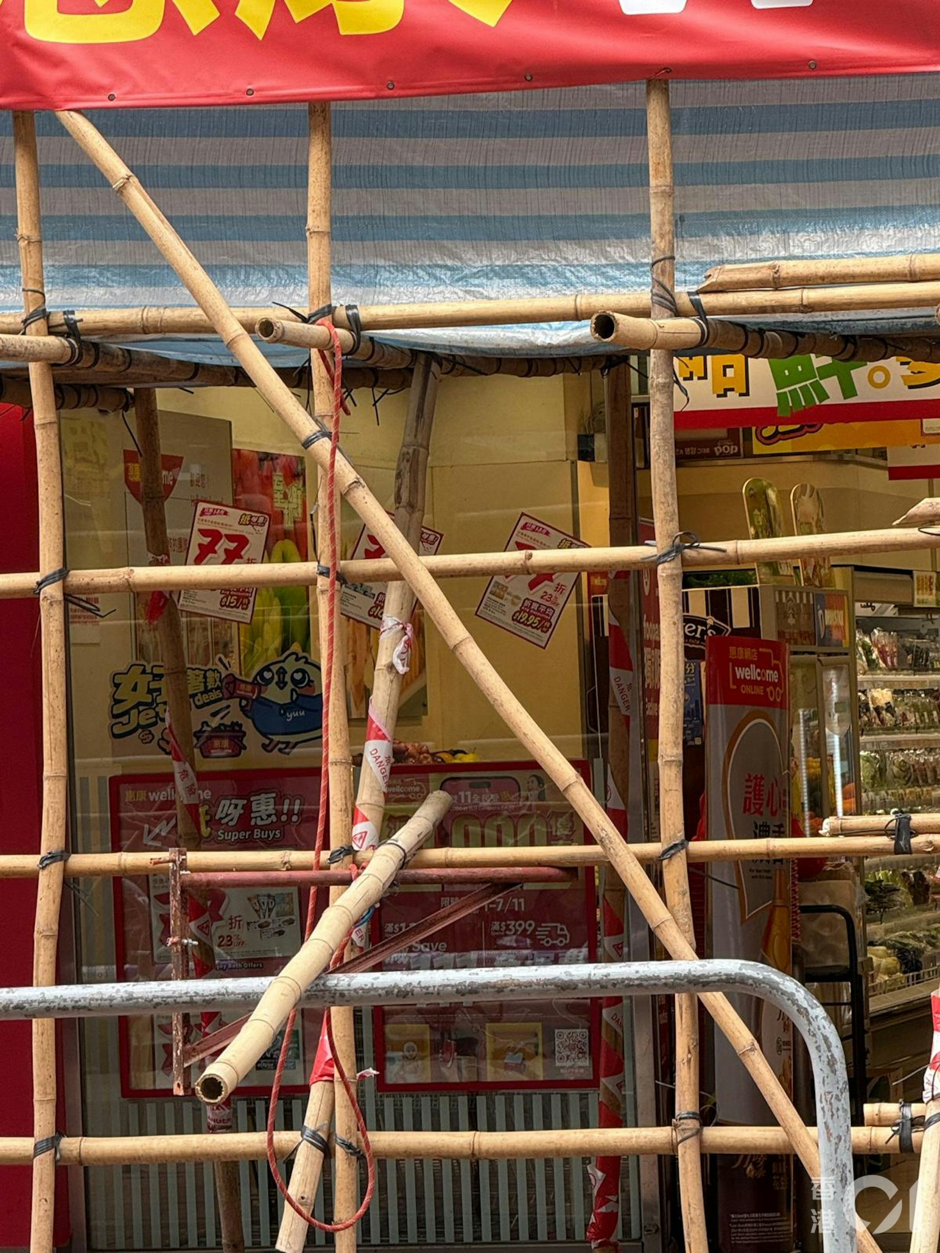 ; W* Q+ P3 W' h# K7 {7 h) {! k目擊事發經過的陳先生指,事主由棚架近頂部位置,連同兩支竹及狗臂架一同墮下。(羅日昇攝)
