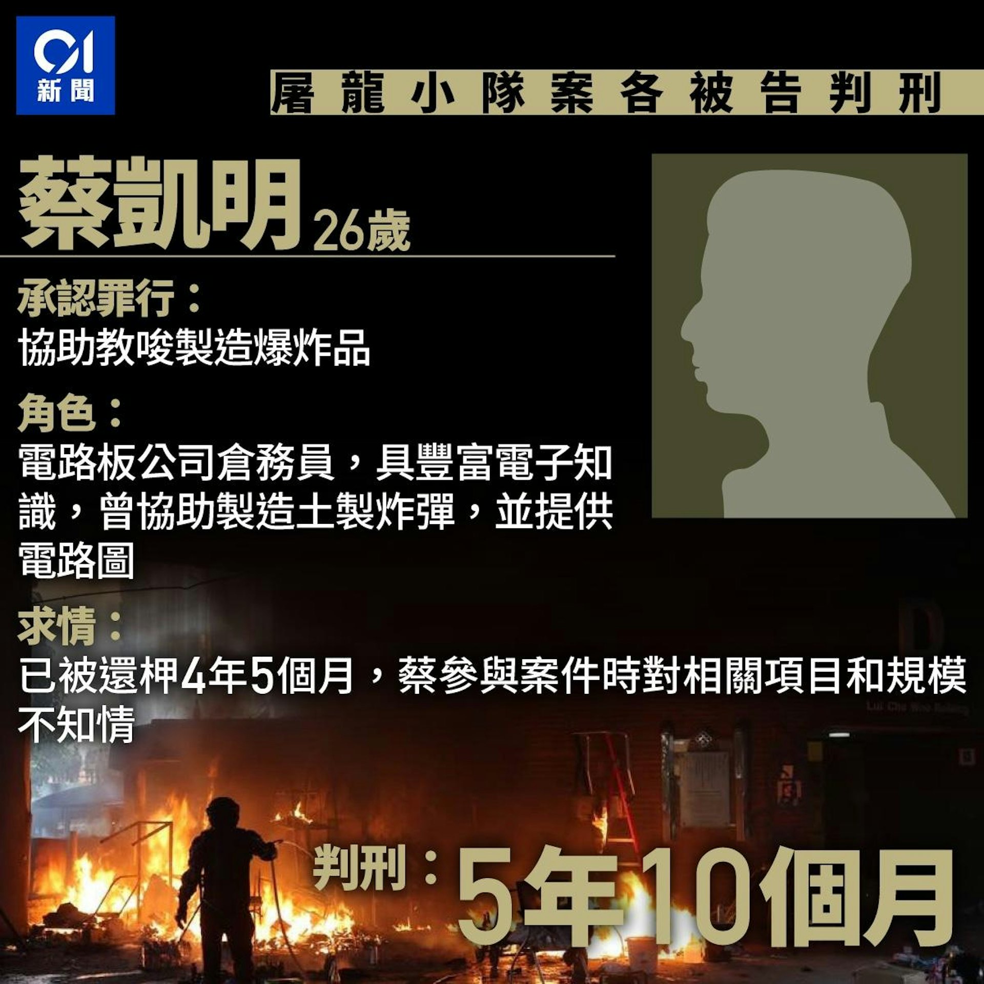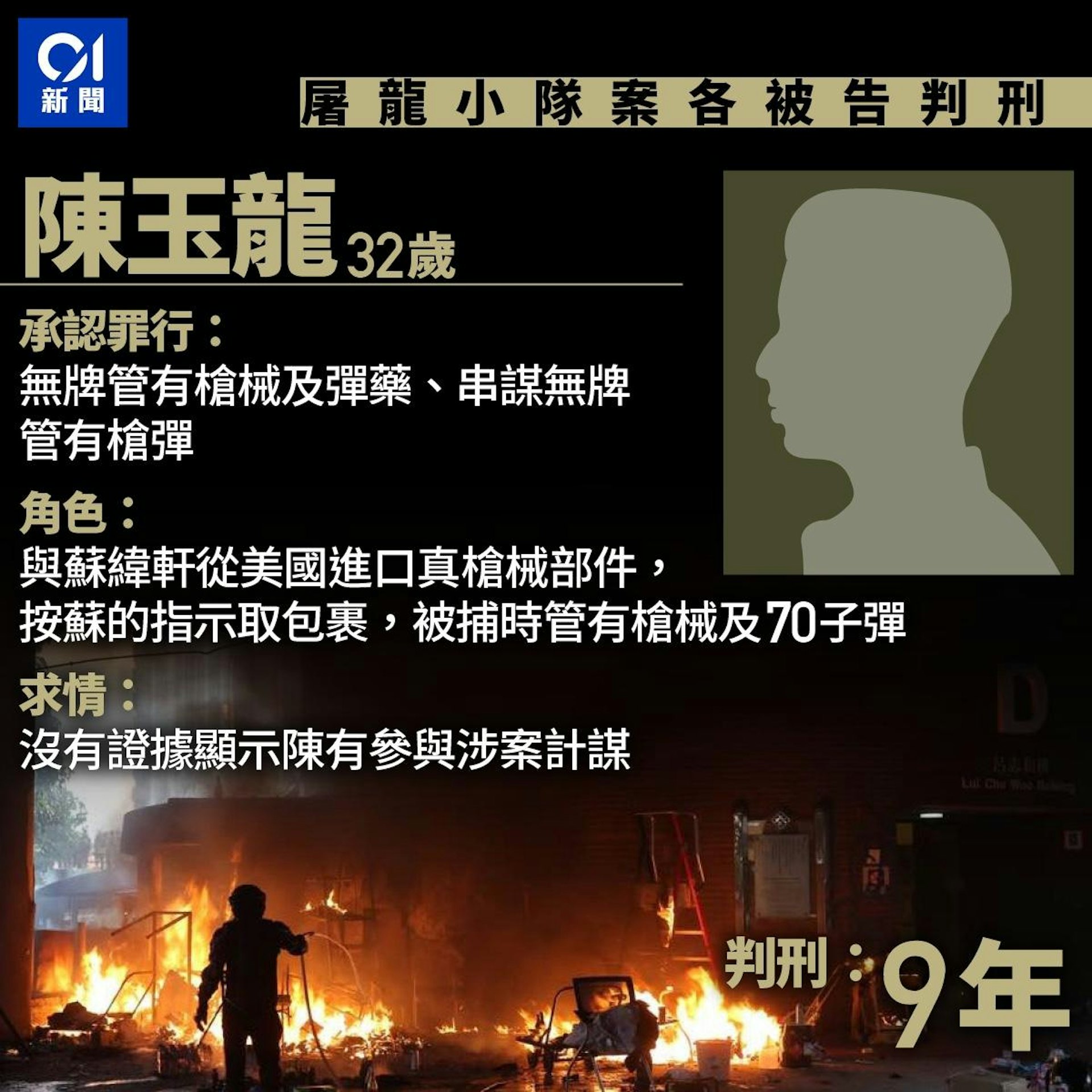 / N6 N+ f; g3 o1 v0 Q P* M* H. I! a另蔡凱明承認「協助及教唆製造爆炸品」罪;陳玉龍則承認「無牌管有槍械及彈藥」、「串謀無牌管有槍械及彈藥罪」兩罪。蔡判囚5年10個月,陳判囚9年。