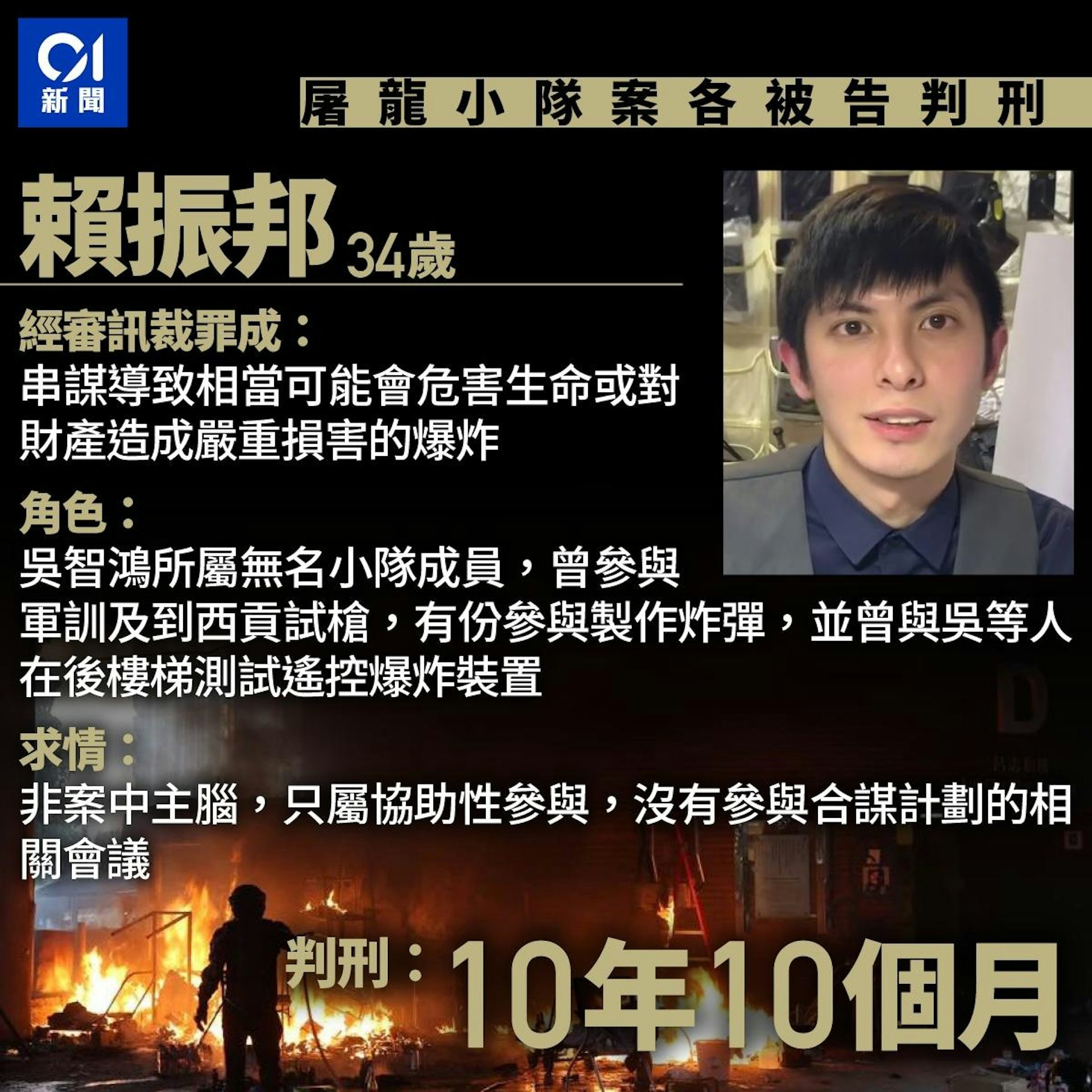 審訊中唯一被罪成被告賴振邦,與另一污點證人彭軍壕均為該無名小隊成員。當中賴被裁定首罪的交替控罪「串謀導致相當可能會危害生命或對財產造成嚴重損害的爆炸」罪成,賴判囚10年10個月,彭軍壕則承認首罪,判囚10年。