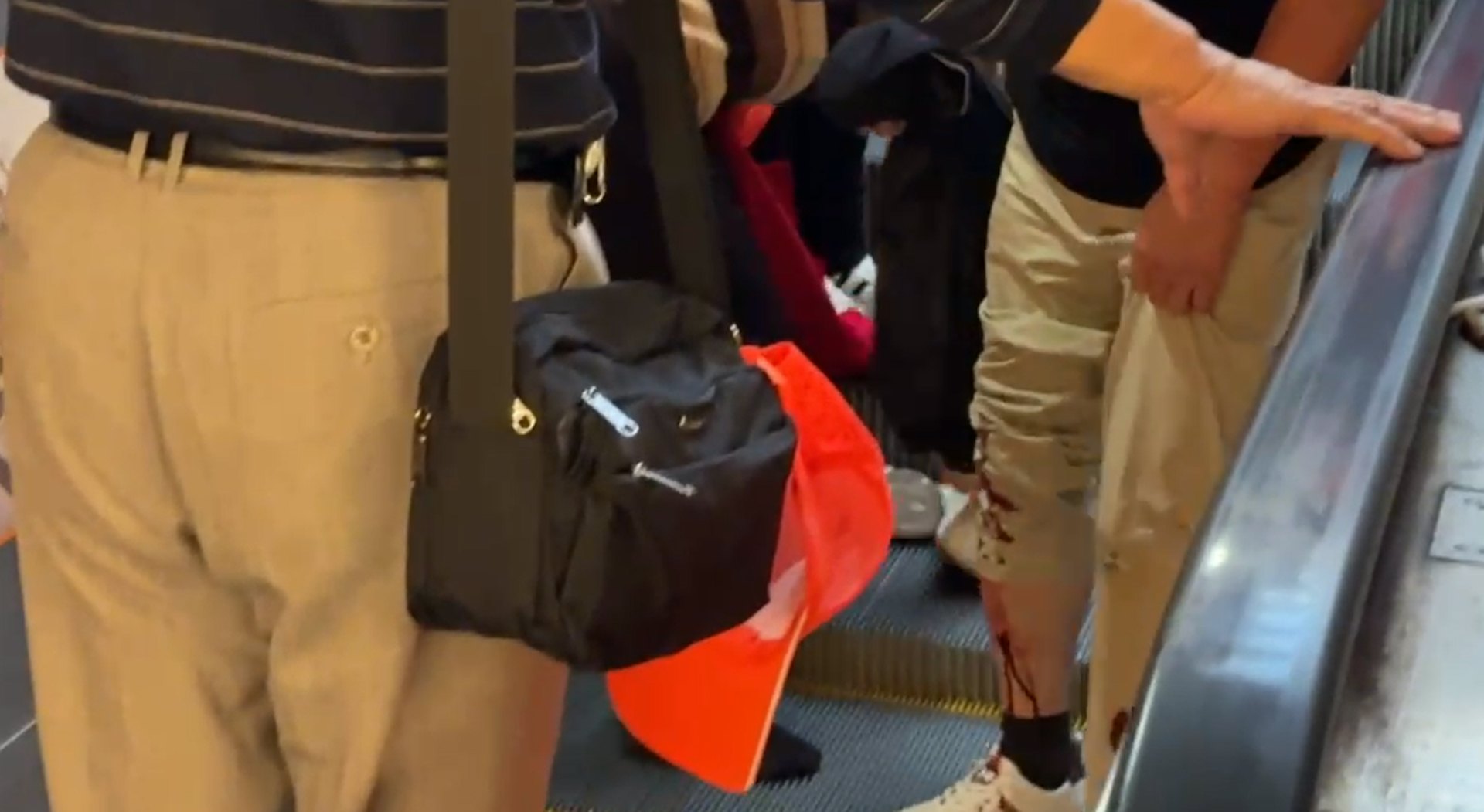 - e/ _ P. x$ h; M# J6 {6 m現場影片可見,事發後有鞋及帽等物品飛脫,散落一地;其中兩人倒臥於扶手電梯中段位置,一名熱心男子慌忙扶起其中一名白髮漢;另有多人跌倒在扶手梯接近底部,有男傷者小腿血流如注,染滿長褲,坐於毗鄰的樓梯級止血待援。