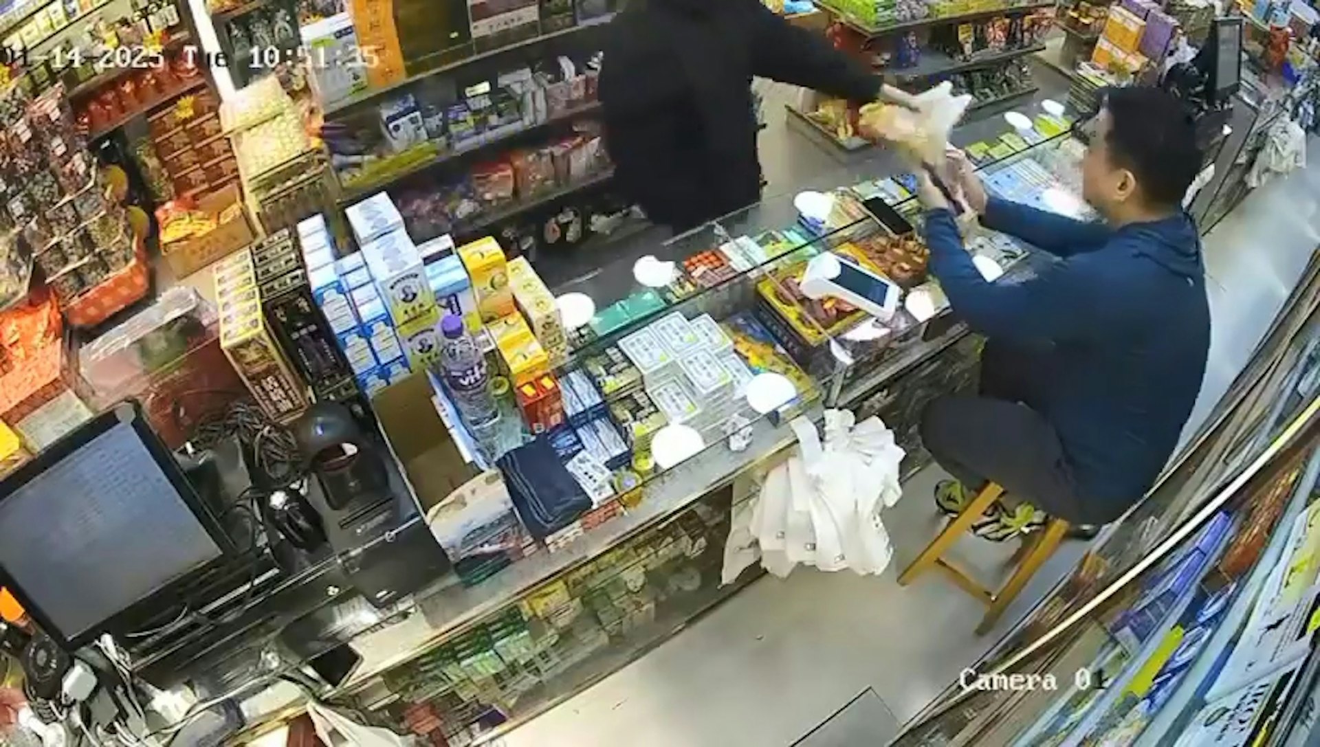據藥房閉路電視片段可見,事發在今早(14日)近11時,一名男店員坐在櫃枱玩手機期間,一名黑衣男子手持一包沙嗲魚串貨物走近,並遞出一張鈔票付款。店員收錢後「甩一甩」鈔票、又反轉查看背面,再舉起鈔票以燈光照射檢驗。